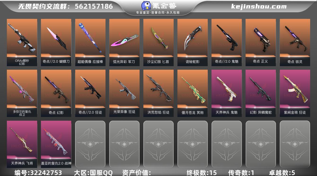 【Hww436】Q区 皮肤价值39810【14橙皮 2金皮 8紫皮 91皮肤 28英雄 152卡面 940已用源晶】 黄金 优质装备:2022全球冠军赛套装,狂徒-混沌序曲,狂徒-塑水宗,狂徒-堕天遗武,狂徒-盖亚的复仇,狂徒-紫阙金琅 【套装】:2022全球冠军赛套装,VCTxEDG 队伍套装,橙色疾影套装 【英雄】:幻棱,炼狱,维斯,暮蝶,钛狐,壹决,铁臂,捷风,雷兹,幽影,不死鸟,贤者,猎枭,蝰蛇,零,芮娜,奇乐,尚勃勒,霓虹,斯凯,夜露,星礈,K/O,海神,盖可,黑梦,钢锁 【近战武器】:近战武器-2022全球冠军赛 蝴蝶刀,近战武器-紫金爪刀,近战武器-威龙之刃,近战武器-鬼丸国纲,近战武器-珍珠棘贝 短剑,近战武器-超能偶像 应援棒,近战武器-橙色疾影 登山镐,近战武器-荒土机兵 热能刀,近战武器-神圣领域 战刀 【狂徒】:狂徒-混沌序曲,狂徒-塑水宗,狂徒-堕天遗武,狂徒-盖亚的复仇,狂徒-紫阙金琅,狂徒-离子武器//2.0,狂徒-超能偶像,狂徒-荒土机兵 【幻影】:幻影-源能者娱乐系统,幻影-2022全球冠军赛,幻影-珍珠棘贝,幻影-神圣领域,幻影-橙色疾影,幻影-聚合之力,幻影-纳米打击,幻影-战术小伙伴 【戍卫】:戍卫-天界神兵,戍卫-超能偶像,戍卫-钢轨卫士,戍卫-珍珠棘贝,戍卫-逆冲蛮牛,戍卫-月球哨兵 【獠犬】:獠犬-神圣领域,獠犬-采蜜小蜂队,獠犬-复古浪潮,獠犬-逆冲蛮牛 【冥驹】:冥驹-源能者娱乐系统,冥驹-荒土机兵,冥驹-复古浪潮,冥驹-星云暗涌 【飞将】:飞将-聚合之力,飞将-橙色疾影,飞将-光导纤维 【莽侠】:莽侠-深海水族,莽侠-月球哨兵 【战神】:战神-神圣领域,战神-采蜜小蜂队,战神-深海水族 【奥丁】:奥丁-纳米打击,奥丁-战术小伙伴 【判官】:判官-超能偶像,判官-采蜜小蜂队,判官-纳米打击x 【雄鹿】:雄鹿-复古浪潮,雄鹿-逆冲蛮牛,雄鹿-月球哨兵 【骇灵】:骇灵-荒土机...