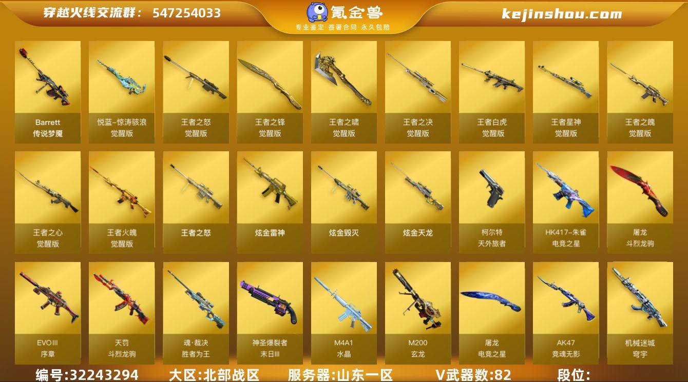 实名:不可二次实名 VIP等级:VIP6 V武器数:82 王者武器数:13 CF点:90 传说梦魇 AK47-竞魂无影,EVOⅢ-序章,魂·裁决-胜者为王,HK417-朱雀-电竞之星,柯尔特-天外旅者,M200-玄龙,M4A1-水晶,神圣爆裂者-末日III,天罚-斗烈龙驹,屠龙-电竞之星,屠龙-斗烈龙驹,回声刃-荣耀传说,回声刃-荣耀之巅,机械迷城-穹宇,M4A1-赤狱骑士,QBZ191-银翼,无影-神兵利器,AK47-B-身先士卒,Glock18-武圣,AK47-黑武士-锦绣游龙,AK47-火麒麟,AK47-无影,AK47-黑鲨,AK47-黑武士,M4A1-雷神,黑骑士-海王,M4A1-黑骑士,M4A1-死神,M4A1-黑龙,M4A1-青龙,M4A1-龙血,M4A1-武圣,白虎-电玩蓝兔,M200-幻神,Barrett-毁灭,Barrett-极光,Barrett-朱雀,AA-12-雷霆,AK12-天启,AN94-超新星,HK417-朱雀,QBZ03-金色蔷薇,9A91-烈火,屠龙,龙啸,麒麟刺,擎天,炽芒蝶刃,龙啸-荣耀世冠,AK47-B-常胜将军,Barrett-暗月传说,斩神刀-雷暴,AK47-B-战士,AK47-B-战神,AK-47-猩红传说,裁决,天神,柯尔特-冠军之特,G36C-幻影 悦蓝-惊涛骇浪-觉醒版,王者之怒-觉醒版,王者之锋-觉醒版,王者之啸-觉醒版,王者之决-觉醒版,王者白虎-觉醒版,王者星神-觉醒版,王者之魄-觉醒版,王者之心-觉醒版,王者火魄-觉醒版,王者之怒 HK417-朱雀-电竞之星-竞星跃动音效卡,屠龙-电竞之星-竞星跃动音效卡,M4A1-黑骑士音效卡,Barrett-极光音效卡,Barrett-毁灭音效卡,M4A1-雷神音效卡,AK47-火麒麟音效卡 炫金雷神,炫金毁灭,炫金天龙 羊驼玩偶,魔能飞环-曼陀罗,猩红司令玩偶-M37,C.A.T,巴雷特-零-水下丽影 卖家说:神威莲华 传说梦魇 冠军之特 幻神加kz冠军 蝴蝶小人 八盘八烈五炼狱 双炼狱狮子 幻影g36 觉醒王者星神白虎裁决王者新海豹突击队 生化爆破挑战全装