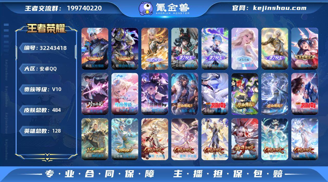 贵族等级:V10 典藏皮肤数:2 珍品无双皮肤数:0 无双皮肤数:6 珍品传说皮肤数:8 传说皮肤数:76 史诗皮肤数:159 皮肤数:484 英雄数:128 段位:至圣王者 卖家说:游戏数据具体请看图,很快就可以二次了 这两个月左右,这号我是4500买的 玩了三个月