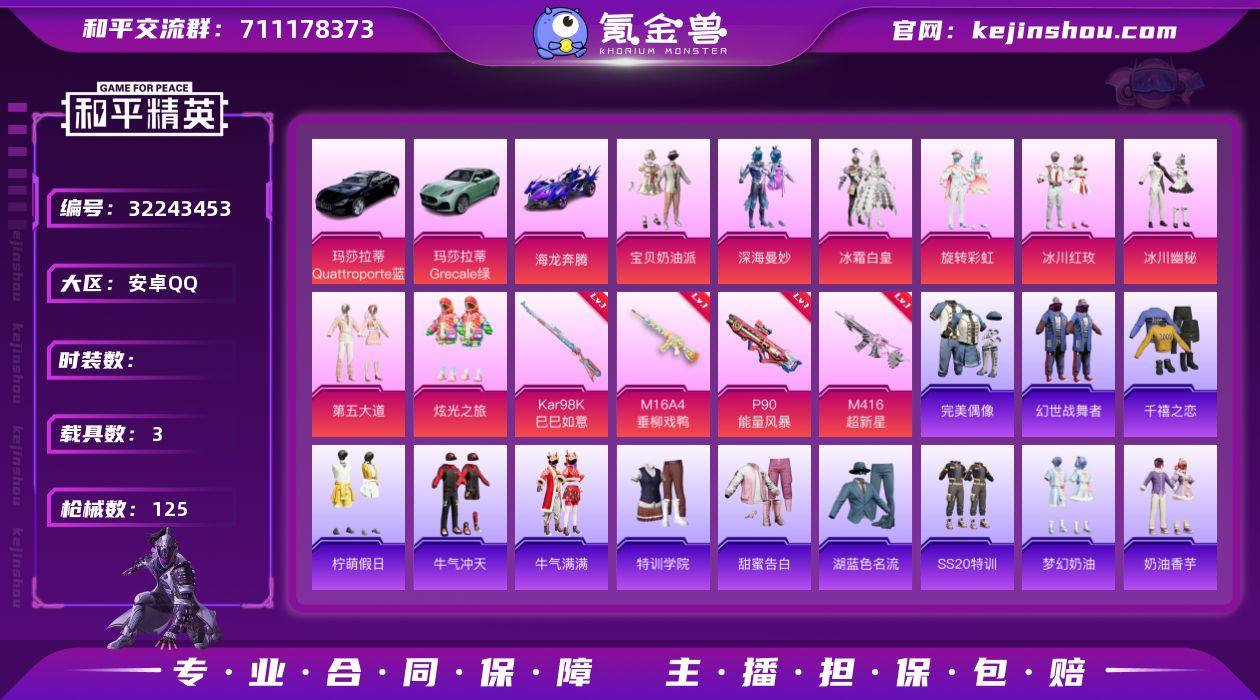 256-【可二次】【因赛季更新游戏段付以上号为准!】 安卓Q-3载具8粉装6特效枪2热门73套装125枪皮 4w热力值 2印记 历史超级王牌4星 【3载具】 玛莎拉蒂G绿色 玛莎拉蒂Q蓝色 海龙奔腾 【8粉装】 宝贝奶油派 深海曼妙 炫光之旅 第五大道 冰川幽秘 冰霜白皇 冰川红玫 旋转彩虹 【6特效枪】 M416-超新星 (3级) Kar98K-巳巳如意 (3级) P90-能量风暴 (7级) M16A4-垂柳戏鸭 (7级) Mk14-福马献瑞 (4级) AA12-G-萌骑幻想 (5级) 【2热门】 龟仙人 破蛋小黄鸡 【1飞行器】 启明星飞行器 【2背包】 梦幻火箭背包 甜蜜誓约背包