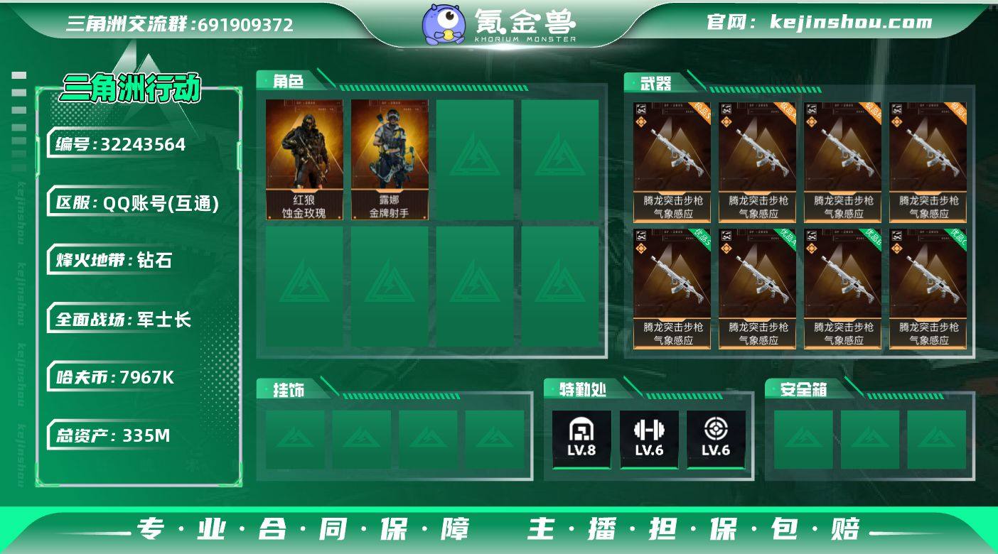 编号98354 不可二次 等级60 总资产335m 流动资产255m 哈夫币7967k 3近战皮 1干员皮 s8高级安全箱 仓库lv8 训练中心lv6 靶场lv6 近战-怜悯 近战-黑海 近战-暗星 红狼-蚀金玫瑰