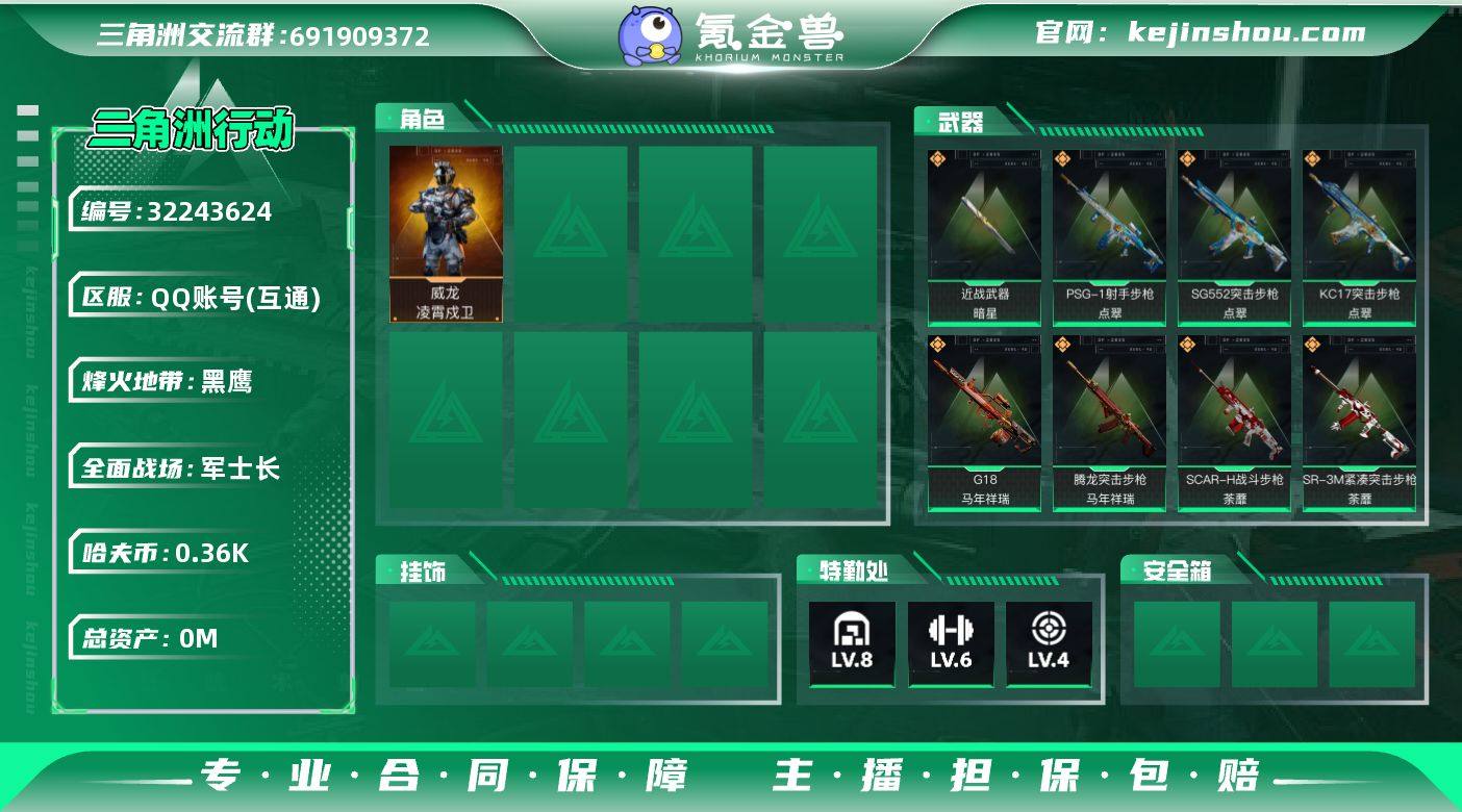 实名: 不可修改 烽火地带段位: 黑鹰 全面战场段位: 军士长 总资产: 42 哈夫币: 366 干员外观: 威龙-凌霄戍卫 传说武器皮肤: 近战-暗星,MK47突击步枪-暗星,SR-3M紧凑突击步枪-暗星,QBZ95-1突击步枪-凌霄戍卫,K416突击步枪-行动记录,腾龙突击步枪-马年祥瑞,G18-马年祥瑞,SCAR-H战斗步枪-荼蘼,PKM通用机枪-荼蘼,SR-3M紧凑突击步枪-荼蘼,勇士冲锋枪-万金泪冠,腾龙突击步枪-万金泪冠,AWM狙击步枪-万金泪冠,SMG-45冲锋枪-锦绣,K437突击步枪-锦绣,AKM突击步枪-锦绣,KC17突击步枪-点翠,PSG-1射手步枪-点翠,SG552突击步枪-点翠