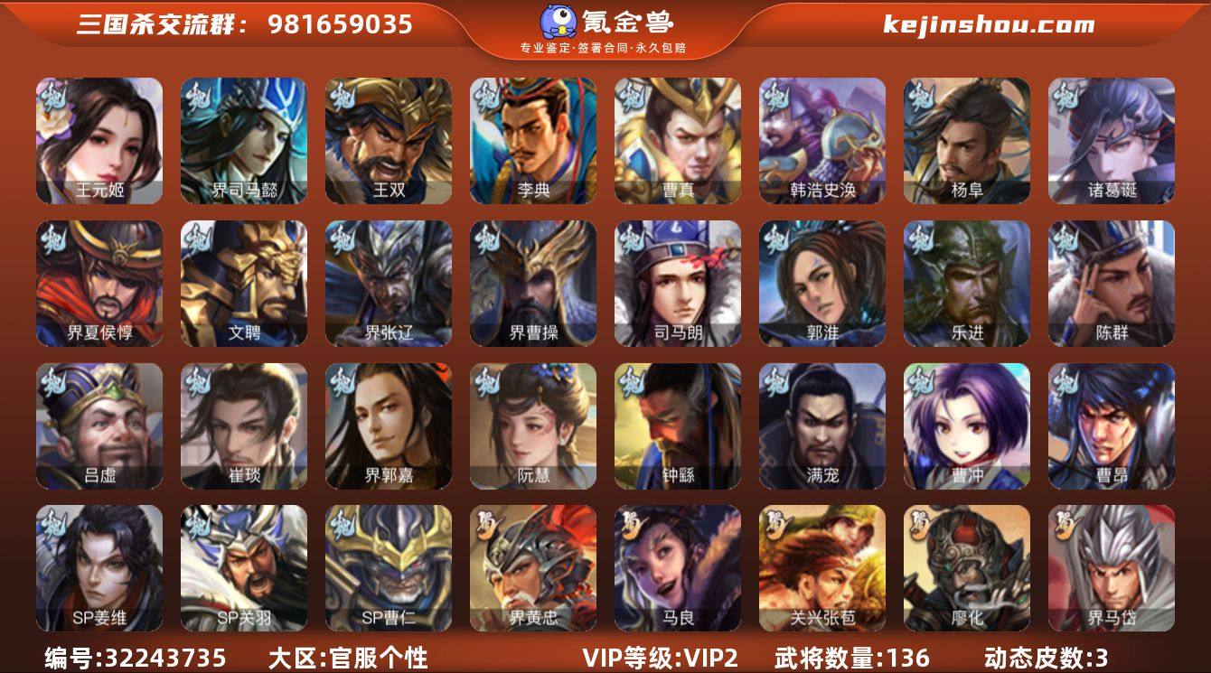【4297】官阶:先锋将军;VIP等级:VIP2;史诗武将数量:5;动态皮肤数量:3;武将总数:136;史诗宝珠数量:0;将魂数量:140;神将:0;魏国史诗武将:2;蜀国史诗武将:1;吴国史诗武将:1;群史诗武将:2 王元姬,界黄忠,界徐盛,星黄忠,麹义,SP关羽,SP曹仁,乐进,曹昂,诸葛诞,文聘,SP姜维,曹冲,郭淮,满宠,界曹操,界司马懿,界夏侯惇,界张辽,界郭嘉,李典,曹真,韩浩史涣,陈群,钟繇,司马朗,吕虔,王双,崔琰,杨阜,阮慧,马良,关兴张苞,廖化,界马岱,刘封,界法正,界关兴张苞,界张飞,界赵云,吴懿,周仓,张松,甘夫人,诸葛瑾,孙鲁育,程普,韩当,潘璋马忠,界甘宁,界吕蒙,界黄盖,界周瑜,界大乔,界陆逊,孙鲁班,朱桓,顾雍,全琮,桥公,界孙鲁班,谋韩当,谋小乔,伏完,界袁术,伏皇后,李儒,华雄,袁术,界华佗,公孙瓒,蔡夫人,严白虎,曹节,卢植,张济,董承,界刘表,界公孙瓒,王元姬-婆娑起舞(动态),太史慈-涤荡江东(动态),麹义-扬刀立威(动态)