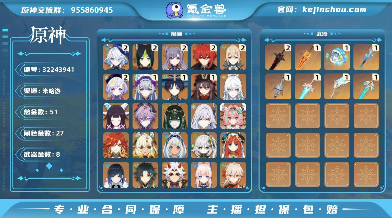 邮箱: 不送邮/死邮 总黄数: 51 冒险等级: 59 2命金色角色: 二命迪卢克,二命七七,二命刻晴,二命琴,二命提纳里,二命芙宁娜 1命金色角色: 一命胡桃,一命流浪者,一命梦见月瑞希 0命金色角色: 枫原万叶,莫娜,魈,珊瑚宫心海,荒泷一斗,夜兰,妮露,纳西妲,迪希雅,玛拉妮,希诺宁,玛薇卡,瓦雷莎,丝柯克,奈芙尔,杜林,哥伦比娅,兹白 拥有武器: 狼的末路,天空之翼,天空之傲,天空之刃,图莱杜拉的回忆,静水流涌之辉,冲浪时光,焚曜千阳 2精武器: 狼的末路 1精武器: 天空之翼,天空之傲,天空之刃,图莱杜拉的回忆,静水流涌之辉,冲浪时光,焚曜千阳