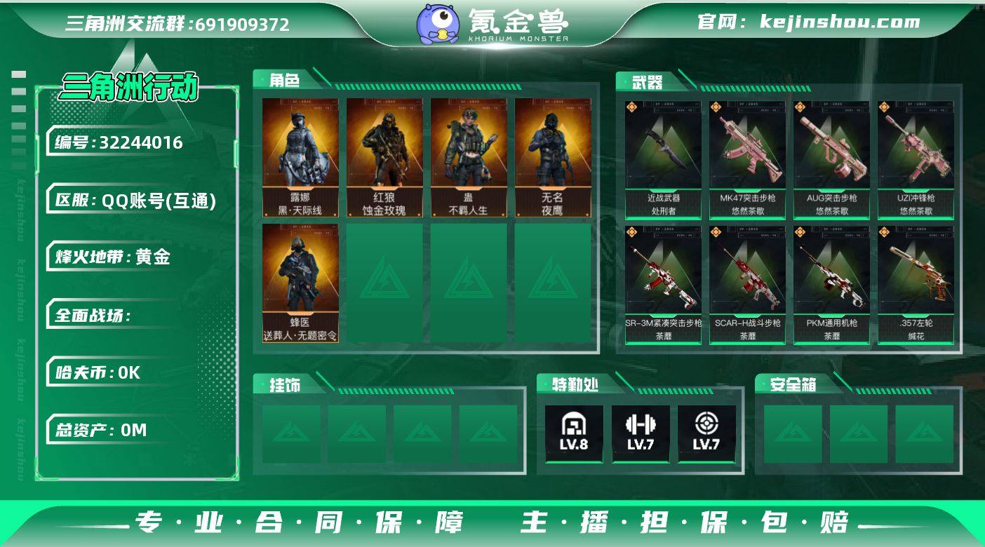 tx1478 总资产115M 烽火等级60级 天才少年徽章 守信不渝称号 红狼蚀金玫瑰捆绑包 露娜黑天际线捆绑包 茶蘼捆绑包 锦绣捆绑包 悠然茶歇捆绑包 缄花捆绑包 捞点薯条捆绑包 特斯拉线圈捆绑包 处刑者单刀皮(3级) S8赛季3x3箱子 (威龙凌霄戍卫差三发保底) (骇爪水墨云图差4发保底) 特勤处高等级(仓库8体力7负重7) 部门高等级 收藏室有红(23个)S4S5S8赛季通行证 无名-夜鹰 蜂医-送葬人 蛊-不羁人生 仓库多红 63发AWM子弹 300三角币 8M纯币 (三角洲0违规记录)