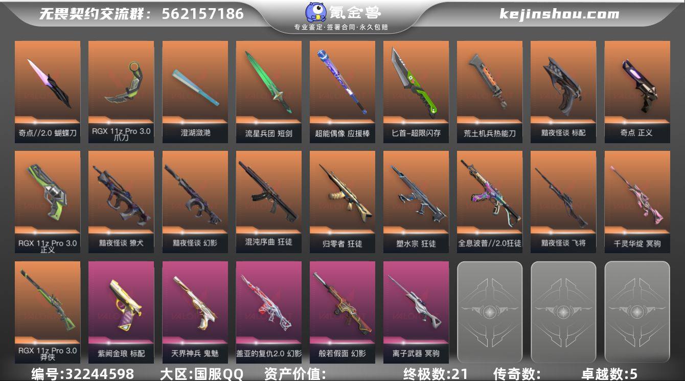 【套装】:RGX 11z Pro//3.0套装,黯夜怪谈套装 【英雄】:幻棱,炼狱,维斯,暮蝶,钛狐,壹决,铁臂,捷风,雷兹,幽影,不死鸟,贤者,猎枭,蝰蛇,零,芮娜,奇乐,尚勃勒,霓虹,斯凯,夜露,星礈,K/O,海神,盖可,黑梦,钢锁 【近战 武器】:近战武器-奇点//2.0 蝴蝶刀,近战武器-RGX 11z Pro//3.0 爪刀,近战武器-澄湖潋滟,近战武器-鬼丸国纲,近战武器-流星兵团 短剑,近战武器-超能偶像 应援棒,近战武器-超限闪存 匕首,近战武器-荒土机兵 热能刀,近战武器-夜刃诡镰 【狂徒】:狂徒-归零者,狂徒-混沌序曲,狂徒-全息波普//2.0,狂徒-塑水宗,狂徒-超能偶像,狂徒-荒土机兵,狂徒-流星兵团 【幻影】:幻影-黯夜怪谈,幻影-般若假面,幻影-盖亚的复仇//2.0,幻影-超限闪存,幻影-聚合之力,幻影-纳米打击 【戍卫】:戍卫-超能偶像,戍卫-浮光跃金,戍卫-逆冲蛮牛,戍卫-战术熊与伙伴们 【獠犬】:獠犬-黯夜怪谈,獠犬-采蜜小蜂队,獠犬-模拟赫兹,獠犬-逆冲蛮牛 【冥驹】:冥驹-千灵华绽,冥驹-离子武器,冥驹-荒土机兵,冥驹-模拟赫兹 【飞将】:飞将-黯夜怪谈,飞将-聚合之力,飞将-战术熊与伙伴们 【莽侠】:莽侠-RGX 11z Pro//3.0,莽侠-超限闪存,莽侠-纤云弄巧 【战神】:战神-采蜜小蜂队,战神-浮光跃金 【奥丁】:奥丁-流星兵团,奥丁-纳米打击 【判官】:判官-超能偶像,判官-采蜜小蜂队,判官-纳米打击x 【雄鹿】:雄鹿-模拟赫兹,雄鹿-逆冲蛮牛 【骇灵】:骇灵-荒土机兵,骇灵-流星兵团,骇灵-浮光跃金 【蜂刺】:蜂刺-超限闪存,蜂刺-聚合之力,蜂刺-纤云弄巧 【标配】:标配-黯夜怪谈,标配-紫阙金琅,标配-超能偶像,标配-荒土机兵,标配-浮光跃金,标配-战术熊与伙伴们 【正义】:正义-RGX 11z Pro//3.0,正义-奇点,正义-超限闪存,正义-纳米打击,正义-纤云弄巧 【鬼魅】:鬼魅-天...