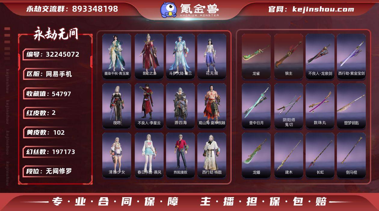 永劫无间 双排修罗 狼主龙雀双红阔刀 胡桃水手服20万幻丝 无常宝箱已开90次 可换绑