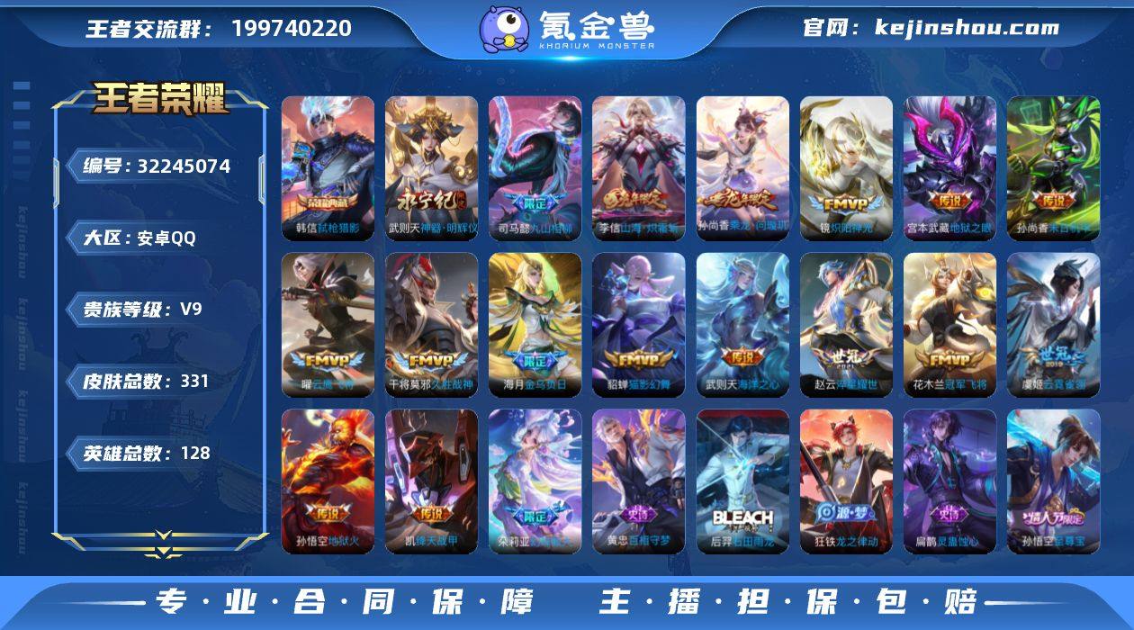 皮肤331/典藏1/传说26/史诗91/英雄128/司马懿全皮/孙权全皮/鬼谷子全皮/空空儿全皮/影全皮/武则天/韩信-弑枪猎影/武则天-神器·明辉仪/后羿神树通天/九山相柳/司空震-愿照·山河定/妲己-愿照·众生和/澜-愿照·九州拓/桑启-鸣野蒿/海月-金乌负日/孙尚香-乘龙·问璇玑/李信-山海·炽霜斩/不知火舞-绯月行/赵云-淬星耀世/公孙离-祈雪灵祝/铠-绛天战甲/镜-炽阳神光/虞姬-启明星使/曜-云鹰飞将/貂蝉-猫影幻舞/干将莫邪-久胜战神/虞姬-云霓雀翎/花木兰-冠军飞将/诸葛亮-武陵仙君/孙尚香-末日机甲/宫本武藏-地狱之眼/孙悟空-地狱火/吕布-天魔缭乱/武则天-海洋之心/白起-狰/李白-谪仙醉月/狄仁杰-阴阳师/虞姬-凯尔特女王/赵云-皇家上将/赵云-引擎之心/嬴政-优雅恋人/鲁班七号-狮舞东方/庄周-蜃楼王/高渐离-死亡摇滚/孙膑-妖精王/扁鹊-炼金王/芈月-重明/周瑜-赤莲之焰/元歌-无心/甄姬-游园惊梦/曹操-烛龙/典韦-穷奇/典韦-蓝屏警告/马可波罗-逐梦之星/狄仁杰-魔术师/狄仁杰-万华元夜/项羽-海滩派对/关羽-冰锋战神/貂蝉-逐梦之音/程咬金-演武夺筹/韩信-傲雪梅枪/亚瑟-狮心王/孙悟空-至尊宝/牛魔-御旌/李元芳-银河之约/李元芳-匿光侦查者/李元芳-云中旅人/钟馗-神迹守卫/钟馗-驱傩正仪/杨玉环-遇见飞天/女娲-朔望之晖/干将莫邪-冰霜恋舞曲/蔡文姬-繁星吟游/太乙真人-饕餮/太乙真人-华丽摇滚/鬼谷子-原初探秘者/鬼谷子-五谷丰年/百里玄策-原初追逐者/百里守约-朱雀志/弈星-混沌棋/沈梦溪-星空之诺/明世隐-疑决卦/裴擒虎-天狼狩猎者/狂铁-御狮/米莱狄-御霄/云中君-纤云弄巧/盾山-御銮/上官婉儿-梁祝/嫦娥-拒霜思/桑启-海盐诗旅/张良-古海寻踪/蒙犽-百解令/鬼谷子-天穹祈灯/伽罗-琥珀纪元/大乔-乘龙·忆丹青/安琪拉-乘龙·聚宝船/沈梦溪-龙舞盛年/刘邦-剑破天穹/刘备-异域游侠/项羽-苍穹之光/露娜-紫霞仙子/阿轲-暗夜猫娘/赵云-未来纪元/...