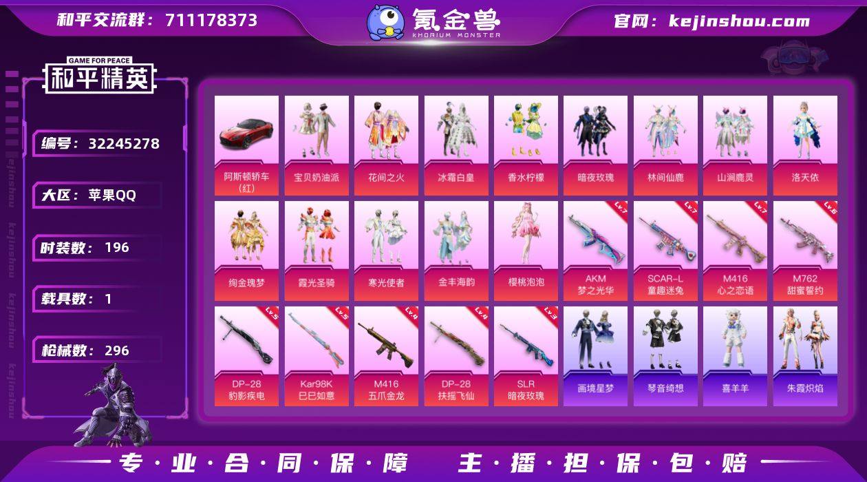 苹果 手Q-13粉装-12特效枪-1载具-4粉色飞行器-94279热力值-16王牌印记-196套装-296枪皮 【热门品类】:套装-小丑鱼,套装-暗夜之虎,套装-龟仙人,套装-潮萌小黄鸭 【粉色套装】:粉装-宝贝奶油派,粉装-花间之火,粉装-冰霜白皇,粉装-香水柠檬,粉装-暗夜玫瑰,粉装-林间仙鹿,粉装-山涧鹿灵,角色-洛天依,粉装-绚金瑰梦,粉装-霞光圣骑,粉装-寒光使者,粉装-金丰海韵,角色-樱桃泡泡 【粉色枪皮等级】:AKM-梦之光华(七级),SCAR-L-童趣迷兔(七级),M416-五爪金龙(四级),M416-心之恋语(七级),M762-甜蜜誓约(六级),UMP45-萌骑冒险(二级),AKS-74U-森灵之息(五级),Kar98K-巳巳如意(五级),Mk14-福马献瑞(五级),SLR-暗夜玫瑰(三级),DP-28-扶摇飞仙(四级),DP-28-豹影疾电(五级) 【粉色载具】:阿斯顿马丁DBS(红) 【粉色枪皮】:AKM-梦之光华,SCAR-L-童趣迷兔,M416-五爪金龙,M416-心之恋语,M762-甜蜜誓约,UMP45-萌骑冒险,AKS-74U-森灵之息,Kar98K-巳巳如意,Mk14-福马献瑞,SLR-暗夜玫瑰,DP-28-扶摇飞仙,DP-28-豹影疾电 【粉色飞行器】:炫彩糖果飞行器,甜蜜誓约飞行器,脆鲨七海飞行器 【粉色降落伞】:幻影战神降落伞,百万伏特降落伞,至尊龙雀降落伞,春暖花开降落伞,甜蜜誓约降落伞,锦绣火鲤降落伞,荧光虫舞降落伞,银刃赛罗降落伞,星之彼岸降落伞,怪笑疯兔降落伞,葫芦兄弟降落伞,暗夜玫瑰降落伞,林间仙鹿降落伞,齐天大圣降落伞,洛神天依降落伞,蓝莓炮弹降落伞,千面幻镜降落伞,旋转彩虹降落伞,暗夜鎏金降落伞,飒粉甜心降落伞,星穹咏叹调降落伞,炫彩糖果降落伞 【稀有套装】:套装-龟仙人,套装-巳巳如意,套装-炫彩糖果,角色-奈斯,角色-魂电,角色-X,套装-马上有钱,套装-糖糖葫芦,套装-青团波波,角色-许七安,套装-燕燕于飞,套装-鱼渊荷华,套装-粉恋花,套装-紫...