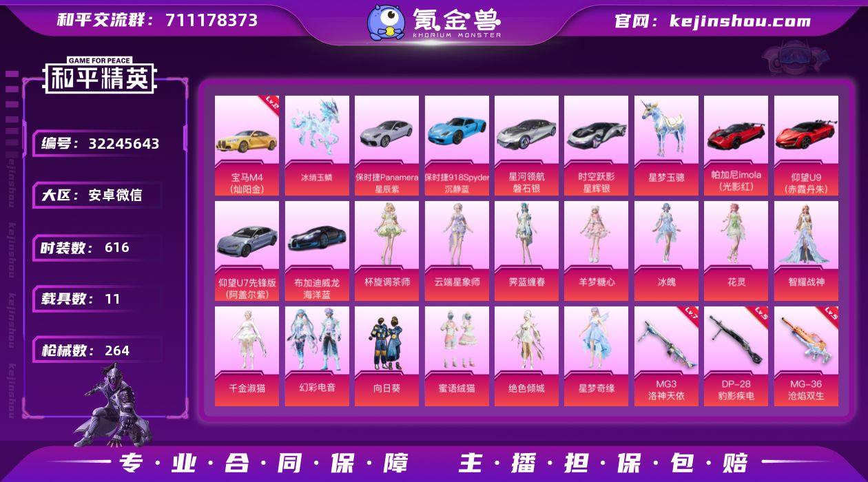YM7732极品载具号/11粉12枪11载具/升级金宝马m4/帕加尼/保时捷/布加迪/仰望U9/白麒麟/水晶马/蓝粉螳螂/星梦奇缘/死噶魔童闹海/实名: 可修改 时装数: 616 载具数: 11 枪械数: 264 战备数: 180 热门装扮: 向日葵,蜜语绒猫,绝色倾城,星梦奇缘,千金淑猫,智耀战神,幻彩电音,羊梦糖心,冰魄,花灵,霁蓝缠春,杯旋调茶师,云端星象师 载具: 布加迪威龙(海洋蓝),仰望U7先锋版(阿盖尔紫),仰望U9(赤霞丹朱),星梦玉骢,时空跃影(星辉银),星河领航(磐石银),帕加尼imola(光影红),宝马M4(灿阳金),保时捷918Spyder(沉静蓝),保时捷Panamera(星辰紫),冰绡玉鳞 稀有枪皮: MG3洛神天依,SCAR-L-锦绣绵绵,M416电玩时刻,M200梦海之灵,M762-青锋波束,DP-28-千金淑猫,Kar98K-巳巳如意,MK14-甜梦熊击,DP-28-豹影疾电,SCAR-L-魔童闹海 哪吒,MG-36-沧焰双生
