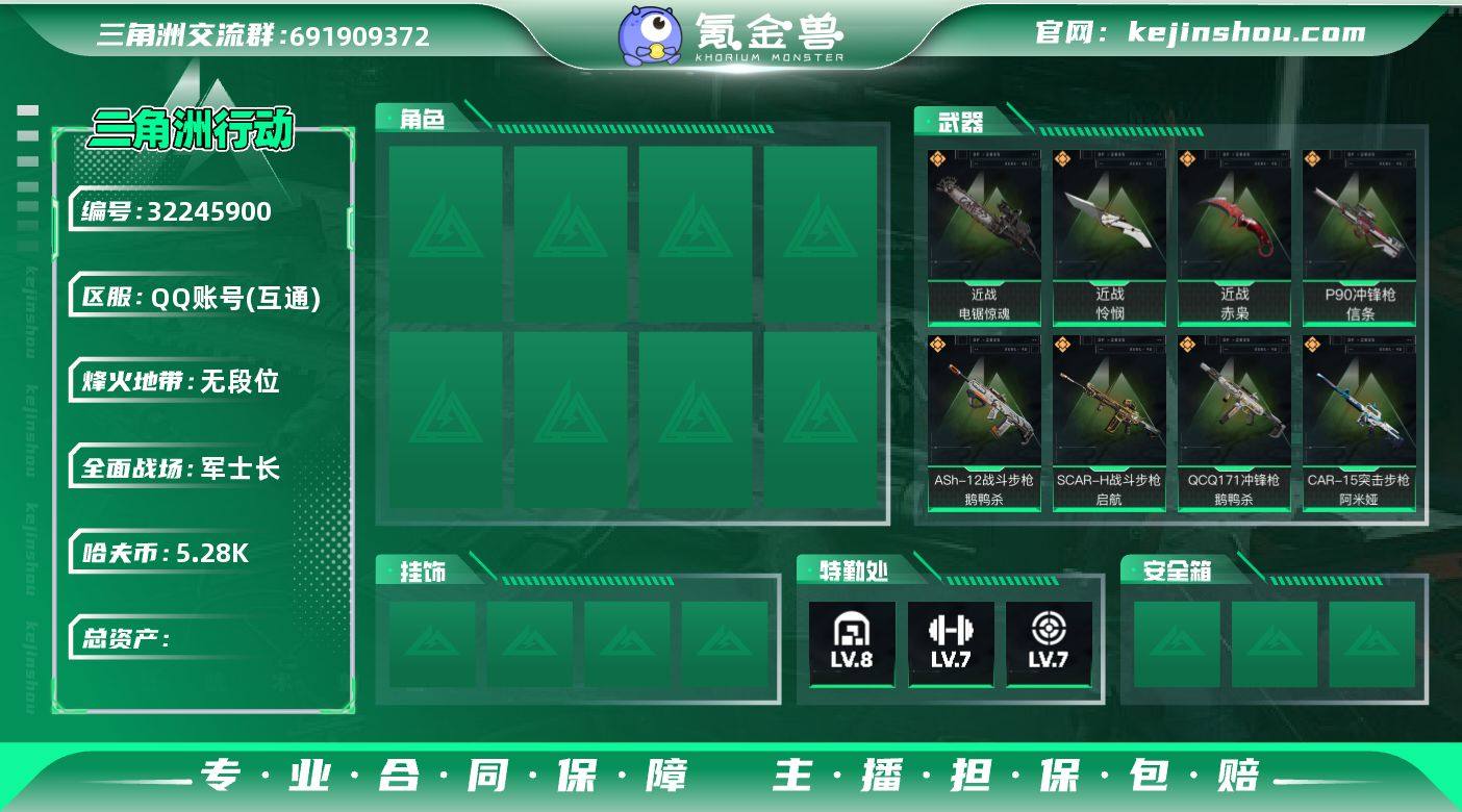 条.怜悯.赤枭·电锯全套/单典藏皮肤.资产121M】【Q区三端互通】【无二次】z9114-特勤处:仓库8级/靶场7级/训练中心7级-总资产121m-哈夫币528w-烽火等级:60级 【干员外观】:红狼-电锯惊魂,露娜-金牌射手 【近战皮肤】:近战-信条,近战-怜悯,近战-赤枭,近战-电锯惊魂,近战-黑鹰 【典藏外观】:SCAR-H战斗步枪-电玩高手 【典藏外观成色】:SCAR-H战斗步枪-电玩高手(优品S) 【传说外观】:QBZ95-1突击步枪-凌霄戍卫,ASh-12战斗步枪-鹅鸭杀,SG552突击步枪-运动员,SCAR-H战斗步枪-启航,G3战斗步枪-骑士,CAR-15突击步枪-阿米娅,KC17突击步枪-电锯惊魂,P90冲锋枪-信条,QCQ171冲锋枪-鹅鸭杀,S12K霰弹枪-电锯惊魂,QJB201轻机枪-鹅鸭杀,M14射手步枪-电锯惊魂,SKS射手步枪-骑士,SR-25射手步枪-信条,复合弓-黑·天际线 【史诗外观】:Vector冲锋枪-潜袭者*3,M1014霰弹枪-潜袭者,PTR-32突击步枪-碎冰行动,QBZ95-1突击步枪-曙光,QBZ95-1突击步枪-竞技风,K416突击步枪-冬日风情,M7战斗步枪-百步穿杨,SG552突击步枪-哈夫克警备,G3战斗步枪-流沙送葬,G3战斗步枪-哈夫克警备,PTR-32突击步枪-工业狂潮,AS Val突击步枪-百步穿杨,MP5冲锋枪-深海恐惧,MP5冲锋枪-战术竞备,MP5冲锋枪-竞技风,Vector冲锋枪-阿萨拉文明,Vector冲锋枪-百步穿杨,Vector冲锋枪-异域战争,勇士冲锋枪-工业狂潮,MP7冲锋枪-六套之力,S12K霰弹枪-曙光,M250通用机枪-囚徒,QJB201轻机枪-炽焰,SV-98狙击步枪-囚徒,M700狙击步枪-百步穿杨,M700狙击步枪-哈夫克警备,AWM狙击步枪-流沙送葬 【稀有外观】:SV-98狙击步枪-花岗岩,As Val突击步枪-星之彩,MP5冲锋枪-星之彩*2,P90冲锋枪-星之彩,MP7冲锋枪-黑潮,PKM通用机枪-黑潮,AUG突击步枪-旧梦,M