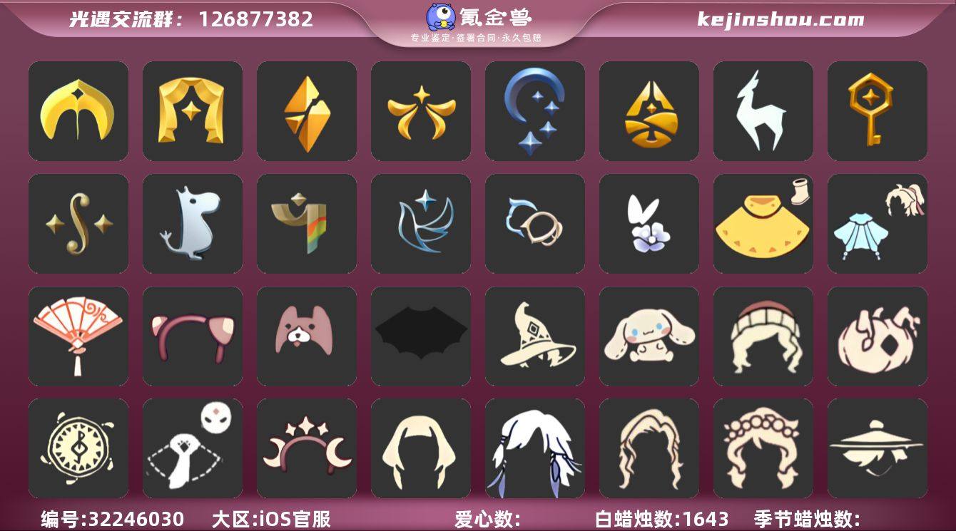 蜡烛数:1643/爱心数:265/雨林/霞谷/圣岛季/表演季/破晓季/欧若拉季/夜行季/归巢季/九色鹿季/筑巢季/二重奏季/姆明季/彩染季/青鸟季/双星季/迁徙季/手碟/鳐鲲斗篷/黄眉企鹅面具/燕尾斗篷/冥龙斗篷/留辫蘑菇头/高领舞服/透明蝶翼斗/肩带/棕熊面具/绒毛斗篷/五塑彩羽发/五塑彩带斗/九色鹿丸子头/九色鹿丝带裤/九色鹿飞天斗篷/光之子试衣/设计师长袍/合奏挂画/蓝色燕尾服/白色高脚钢琴/姆明大伞/姆明抱枕/辉光羚羊面具/彩染围巾斗篷/青鸟毕业面饰/青鸟斗篷/蓝色星星光环/暮星斗篷/蓝色毛绒绒鞋/蓝色毛绒裤子/海牛鹿角头饰/跃动跑鞋/彩虹帽/巫师/小狗周年发饰/粽子发饰礼包/星月头饰/南瓜/猫套/蝴蝶与花发饰礼包/蝙蝠套/青衫落拓礼包/小黄鸭雨衣套装礼包/献瑞折扇礼包/大耳狗抱枕/武士裤/背带裤/搓澡巾/击剑裤/虚荣/花环/红耳机/若笠/平顶帽/白金斗篷/黑金斗篷/红金斗篷/雨伞/黄鼠狼/羊头面具/星月头冠/猫猫头/归巢毕业发型/花环长发/帝企鹅发/玉兔发饰/蝴蝶与花发饰/创始人斗篷/周年线框斗篷/围巾斗篷/小王子围巾/必胜客联动披萨/毕业手碟