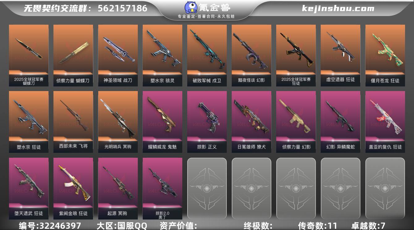 近战武器皮肤: 蝴蝶刀-侦察力量,神圣领域 战刀,2025全球冠军赛 蝴蝶刀 步枪皮肤: 狂徒-紫阙金琅,狂徒-盖亚的复仇,狂徒-偃月苍龙,幻影-侦察力量,戍卫-破败军械,狂徒-塑水宗,狂徒-堕天遗武,獠犬-日冕雄师,幻影-黯夜怪谈,幻影-异鳞魔蛇,狂徒-虚空遗器,2025全球冠军赛 狂徒 佩枪皮肤: 鬼魅-耀鳞威龙,正义-掠影 狙击枪皮肤: 冥驹-起源,冥驹-光明哨兵,飞将-西部未来 冲锋枪皮肤: 骇灵-塑水宗 机枪皮肤: 奥丁-掠影2.0