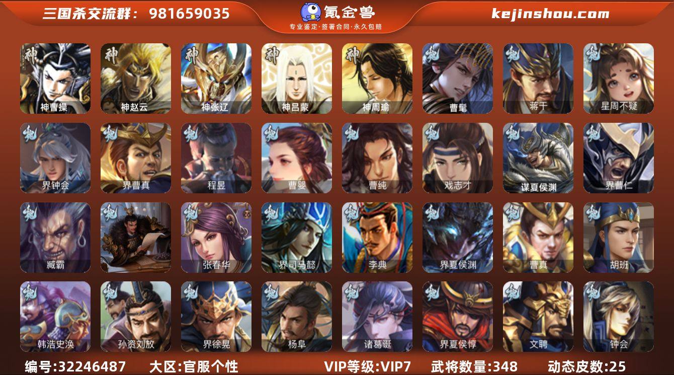 【14789512】官阶:大将军;VIP等级:VIP7;史诗武将数量:32;动态皮肤数量:25;武将总数:348;史诗宝珠数量:1;将魂数量:3102;神将:3;魏国史诗武将:20;蜀国史诗武将:8;吴国史诗武将:3;群史诗武将:9