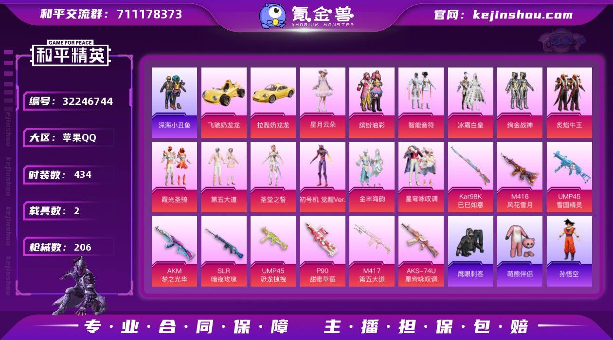 AL691450 【特价苹果q区无敌战神 12粉9个特效2车 优质套装:套装-浪漫天命,套装-萌熊伴侣,套装-深海小丑鱼,粉装-智能音符,粉装-缤纷油彩,粉装-冰霜白皇,粉装-绚金战神,粉装-炙焰牛王,粉装-霞光圣骑,粉装-第五大道,套装-龟仙人,角色-圣堂之誓,角色-初号机觉醒Ver.,粉装-金丰海韵,粉装-星月云朵,角色-六号稻草人,优质武器皮肤:M416-风花雪月,M416-黄金龙骨,SCAR-L-黄金龙骨,G36C-星穹咏叹调,AKM-梦之光华,AWM-黄金龙骨,Kar98K-星穹咏叹调,Kar98K-巳巳如意,SLR-暗夜玫瑰,M417-第五大道,汤姆逊-智耀战神,UMP45-恐龙拽拽,UMP45-雪国精灵,P90-甜蜜草莓,AKS-74U-星穹咏叹调,短管霰弹-星穹咏叹调粉装-星穹咏叹调 稀有载具:僚机-萌兔起飞,拉轰奶龙龙,飞驰奶龙龙】 热力值63325 枪皮数量206 粉装数12 套装数量122 时装数434 载具数2 战备数122 其他武器皮肤197 头盔92 动作41 伙伴4 其他武器皮肤:GROZA-恐龙拽拽,GROZA-治愈之星,GROZA-异彩先驱,GROZA-田园牧歌,GROZA-2B战斗服款,GROZA-懵萌河马,M762-天降萌叽,M762-瑞龙福将,M762-绯红前夜,M762-雏菊兔兔,M762-第五大道,M416-红色方程式,M416-动感兔斯基,M416-夜灯,M416-绯红前夜,M416-诡夜天鹅,M416-黄金龙骨,M416-糯团青竹,M416-滑板小狐,蜜獾-垂柳戏鸭,蜜獾-天降萌叽,蜜獾-乌木金纹,蜜獾-娇憨猪猪,SCAR-L-红色方程式,SCAR-L-黄金龙骨,SCAR-L-兔兔白日梦,SCAR-L-玉兔迎春,SCAR-L-海盐豹豹,Famas-突变脉冲,Famas-乌木金纹,Famas-桃粉嫣然,G36C-雪国精灵,G36C-乌木金纹,G36C-星穹咏叹调,G36C-懵萌河马,G36C-时空追击者,AKM-萌趣颜团子,AKM-彩虹符号,AKM-夜灯,AKM-生命誓言,AKM-霓虹街区,AKM-恐龙拽拽,AKM-虎虎生威,AKM-龙的传人,AKM-胡桃卫兵,Mk47-乌木金纹,Mk47-妙红点点,M16A4-幻世...