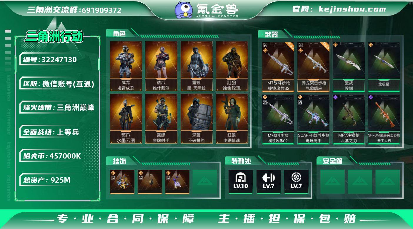 实名:可二次实名 总资产:925M 哈夫币:457000K 烽火地带段位:三角洲巅峰 烽火地带等级:60 全面战场段位:上等兵 10级仓库,7级训练中心,7级靶场,3级潜水中心,2级收藏室 战术部门等级:6 战斗部门等级:6 医疗部门等级:6 研发部门等级:6 后勤部门等级:6 曼德尔砖-棱镜攻势S2:0