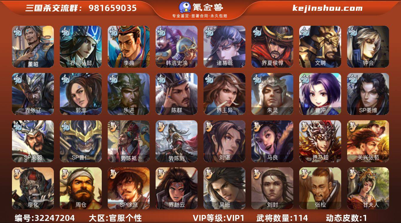 【3980】官阶:先锋将军;VIP等级:VIP1;史诗武将数量:0;动态皮肤数量:1;武将总数:114;史诗宝珠数量:43;将魂数量:6585;神将:0;魏国史诗武将:0;蜀国史诗武将:0;吴国史诗武将:0;群史诗武将:0 SP关羽,SP曹仁,乐进,诸葛诞,朱灵,文聘,SP姜维,钟会,曹冲,郭淮,界王异,界司马懿,界夏侯惇,界张辽,李典,韩浩史涣,陈群,唐咨,董昭,势陈到,马良,关兴张苞,廖化,刘封,界赵云,界马超,SP徐庶,周仓,张松,刘谌,吴班,糜芳傅士仁,甘夫人,势陈祗,孙鲁育,韩当,潘璋马忠,虞翻,朱然,界甘宁,界黄盖,界周瑜,界陆逊,孙鲁班,全琮,界韩当,吕范,谋韩当,伏完,伏皇后,李儒,华雄,袁术,界华佗,界吕布,SP黄月英,势田丰,鲁肃-蛇年端午(动态)