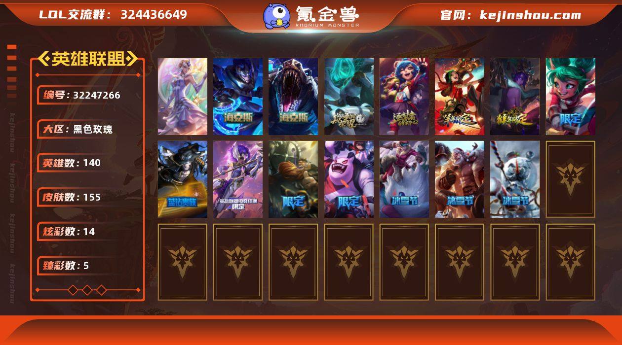 未定级段位-140英雄-155皮肤-14炫彩-1终极-4神话-17限定-17传说-35史诗 【神话皮肤】:十周年纪念安妮,源代码乐芙兰,海克斯科技嘉文四世,海克斯科技雷克顿 【热门头像】:源计划刀妹头像 【臻彩皮肤】:无畏骑士瑟庄妮赤子初心,吕布奉先炫金战神,咖啡甜心璐璐焦糖布丁,星之守护者阿卡丽未来之光,魔女阿卡丽虚荣 【年限皮肤】:神龙烈焰金克丝,紫金罗刹莫甘娜,龙马烈焰波比 【海克斯皮肤】:海克斯科技雷克顿,海克斯科技嘉文四世 【冰雪限定】:喜庆之树茂凯,雪默丁格,魄罗骑士瑟庄妮,圣诞老人布隆,冰雪节辛吉德 【终极皮肤】:大元素使拉克丝 【限定皮肤】:Fnatic古拉加斯,暗杀星努努和威朗普,暗裔英雄盖伦,南瓜头费德提克,无头骑士赫卡里姆,魅惑女巫娜美,蓝色忧郁崔斯特,星之守护者芮尔,波比的巧克力工坊 【传说皮肤】:大天使长米迦勒凯尔,黑夜使者索拉卡,合金巨兽努努和威朗普,女皇艾希,源计划联合艾希,灵能特工娑娜,陆地王者4WD布里茨,太空律动猫猫布里和里茨,源计划净化薇恩,腥红之月鬼武姬阿卡丽,宇航员诺提勒斯,霸天异形卡兹克,神王德莱厄斯,西部天使赛娜,西部魔影卢锡安,真实伤害艾克,源计划毁灭派克 【史诗皮肤】:冰霜烈焰安妮,铁钩船长费德提克,战争机器赛恩,战场公主希维尔,钢铁之心希维尔,圣洁化身索拉卡,源代码索拉卡,兔宝宝提莫,炼金狂士辛吉德,死神卡尔萨斯,熔火之心拉莫斯,飞越疯人院萨科,武动巅峰萨科,恐惧新星普朗克,驯龙大师斯维因,海贼魅影卡特琳娜,龙骑统帅嘉文四世,灵骨工匠奥莉安娜,防弹武僧李青,面包之王潘森,实习护士阿卡丽,银色之牙阿卡丽,铁血女忍阿卡丽,至高君王玛尔扎哈,腥红之月鬼武者慎,暗影妖狐阿狸,海牛猎手菲兹,银河魔装机神菲兹,暗星卡兹克,天启骑士杰斯,勇敢的心奎因,时之砂艾克,霓虹杀拳蔚,幽冥...