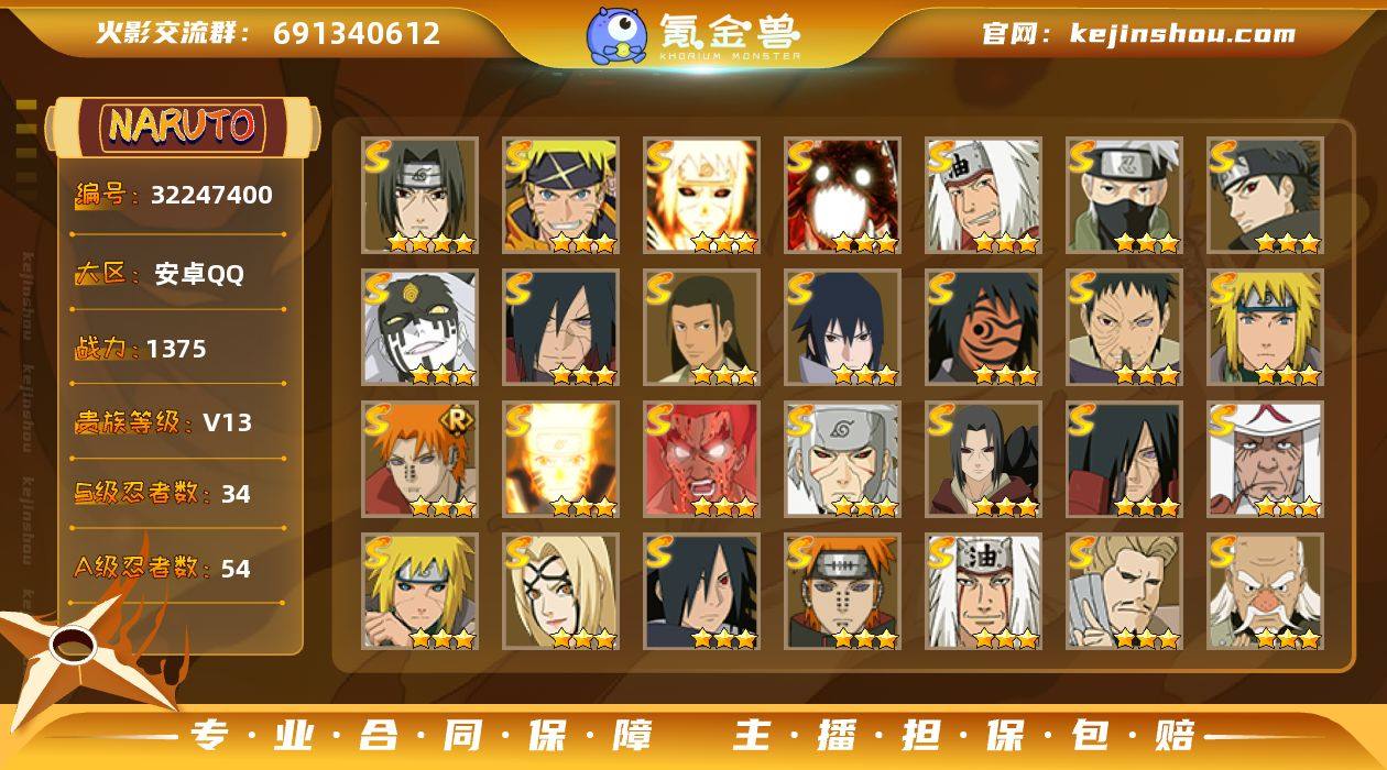 【火影忍者】战斗力:1375W+;段位:中忍2阶;本服排名:158;VIP:V13级;S忍:34个;A忍:54个;通灵兽:23个,S忍:秽土转生解宇智波斑|白面具宇智波斑|忍界大战宇智波带土|须佐能乎旗木卡卡西|秽土转生千手扉间|超佩恩天道|九喇嘛连结波风水门|天道佩恩|传说中的三忍自来也|漩涡鸣人宇智波佐助|须佐能乎宇智波止水|木叶创立宇智波斑|秽土转生宇智波鼬|永恒万花筒宇智波佐助|木叶创立千手柱间|舞之豪杰自来也|大蛇丸(普通)|百豪纲手|纲手(普通)|波风水门|秽土转生波风水门|秽土转生宇智波斑|须佐能乎宇智波鼬 * 4星|红夜之刃神秘面具男|二代目水影鬼灯幻月|死门迈特凯|忍界大战大野木|忍界大战春野樱|九喇嘛连结漩涡鸣人|博人传大筒木金式|大筒木桃式|猿飞日斩(普通)|自来也(普通)|暴怒第六尾漩涡鸣人__A忍:青春爆炸迈特凯|仙人模式巳月|侠隐江湖宇智波佐助|忍界大战李洛克|漂泊浪客佩恩六道|忍界大战日向宁次|四代目土影黑土|木叶上忍猿飞木叶丸|青年长门|晓创生飞段|忍者之路神秘面具男|秽土转生迪达拉|宇智波止水(普通)|元气夏日旗木卡卡西|青年波风水门|青年艾 * 3星|漂泊武士千手扉间|鲛肌融合干柿鬼鲛|忍界大战旗木卡卡西|漂泊武士桃地再不斩|近松十人卫千代|夏日泳装照美冥|半蛇斗篷药师兜|须佐能乎宇智波佐助|九尾查克拉漩涡鸣人|暴怒宇智波带土|火影继承人猿飞日斩|忍界大战秋道丁次|新春限定宇智波鼬|万花筒写轮眼宇智波佐助|五代目雷影达鲁伊|绝|死司凭血飞段 * 4星|疾风传我爱罗 * 4星|飞段(普通) * 4星|小南(普通)|神驹佑将小南|仙人模式漩涡鸣人|迈特凯(普通) * 5星|宇智波鼬(普通)|夏日限定宇智波鼬|干柿鬼鲛(普通) * 5星|秽土转生桃地再不斩|蝎(普通) * 5星|绯流琥蝎|猿飞阿斯玛(普通) * 5星|桃式显现漩涡博人|最终章日向雏田|六代目水影长十郎|宇智波泉奈|羁绊神农|忍...