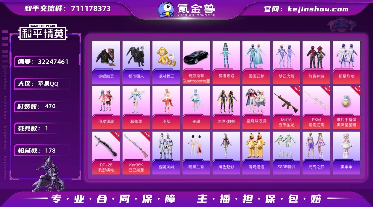 实名: 可修改 时装数: 470 载具数: 1 枪械数: 178 战备数: 1 热门装扮: 梦幻火箭(新101),放客神游,鹰眼刺客,都市猎人,新星烈龙,雪国幻梦,俏皮狐尾,赤蝎幽灵,派对舞王,美琪,小蓝,超弦星,创世·救赎,星穹咏叹调,异瞳寒姬 载具: 玛莎拉蒂Quattroporte(夜幕蓝) 稀有枪皮: M416五爪金龙,PKM江南烟雨,Kar98K-巳巳如意,破片手榴弹-美味星星糖,DP-28-豹影疾电