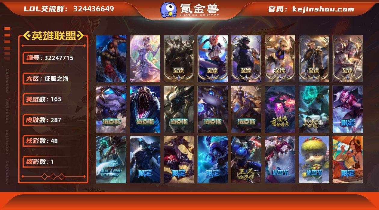 t35808【征服之海】287皮肤 48炫彩 1臻彩 15神话/26限定/37传说/165英雄 账号等级:255 【重要头像】KDA萨勒芬妮 至臻战斗学院蕾欧娜 【重要皮肤】女帝黛安娜至臻 战斗学院蕾欧娜至臻 真实伤害赛娜至臻 灵能特工伊泽瑞尔至臻 真实伤害奇亚娜至臻 腥红之月亚托克斯至臻 海克斯科技瑟庄妮 海克斯科技雷克顿 海克斯科技吉格斯 海克斯科技波比 暗星科加斯 零之枪骑赫卡里姆 胜利女神希维尔 胜利之树茂凯 胜利女神奥莉安娜 胜利枪神格雷福斯 胜利女神莫甘娜 胜利之剑亚托克斯 魄罗骑士瑟庄妮 泳池派对蕾欧娜 泳池派对雷克顿 SKTT1瑞兹 SKTT1伊莉丝 SKTT1贾克斯 暗杀星奥莉安娜 暗杀星努努和威朗普 暗杀星慎 Fnatic迦娜 Fnatic古拉加斯 防暴天使凯尔 冠军典狱长锤石 冠军之志瑞兹 圣诞开心鬼提莫 圣诞驯鹿克格莫 喜庆之树茂凯 勇者奈德丽 地底世界崔斯特 都铎王朝图奇 十周年纪念安妮 源代码乐芙兰 神凰行者瑞羽圣凰艾尼维亚 大元素使拉克丝 灵魂守卫乌迪尔 【传说皮肤】烈焰雄心崔丝塔娜 恶魔男爵瑞兹 驯龙学者黑默丁格 源计划毁灭派克 黑夜使者索拉卡 战场女武神凯尔 神拳李青 暗星尊烬 源计划净化薇恩 神王盖伦 奥德赛凯隐 战斗学院伊泽瑞尔 月蚀骑士蕾欧娜 黑夜使者亚索 西部天使艾希 约德尔国队长提莫 冰川巨兽墨菲特 绅士科加斯 苍穹之光韦鲁斯 冰霜之刃艾瑞莉娅 霸天零式赛恩 西部魔影卢锡安 偶像歌手阿狸 源计划林易 驯龙炮手崔丝塔娜 上古战魂魔腾 泳池派对吉格斯 未来战士凯特琳 霸天异形卡兹克 最终BOSS维迦 星之守护者金克丝 灌篮高手德莱厄斯 腥红之月鬼武姬阿卡丽 钢铁之翼凯尔 女校长菲奥娜 屠龙勇士潘森 【重要炫彩】偶像歌手阿狸极地雪莲 腥红之月卡特琳娜落樱 腥红之月易落樱 皮城女警凯特琳死亡蔷薇