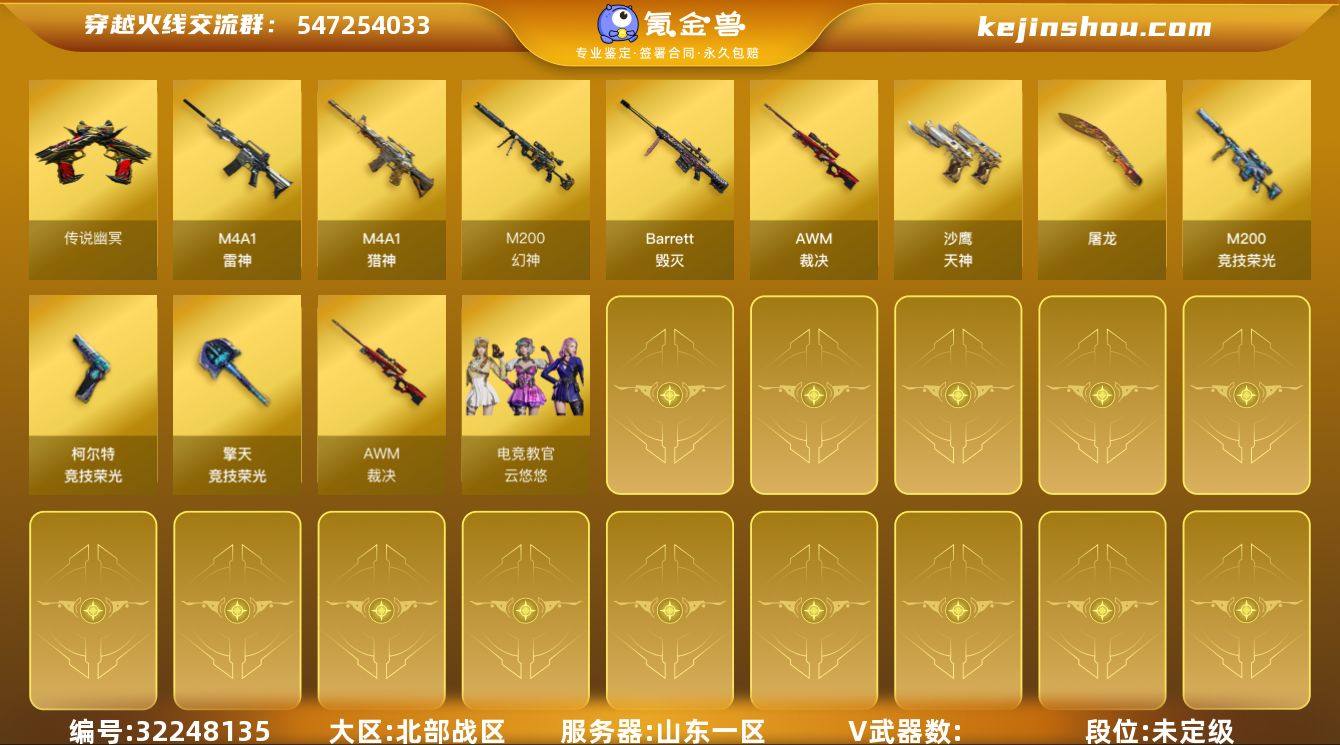 ABC11324/北部/山东一区/钱包注销/可排位/可二次/掌火ID:766684279/47V/传说幽冥/幻神/幻神丹凤/玄豹/M200竞技荣光套/M200竞技荣光/裁决/裁决流光秘银/王者风势/毁灭/雷神/【四防已开】/电竞教官云悠悠/【四防未开】/华/永久AC/细节看图