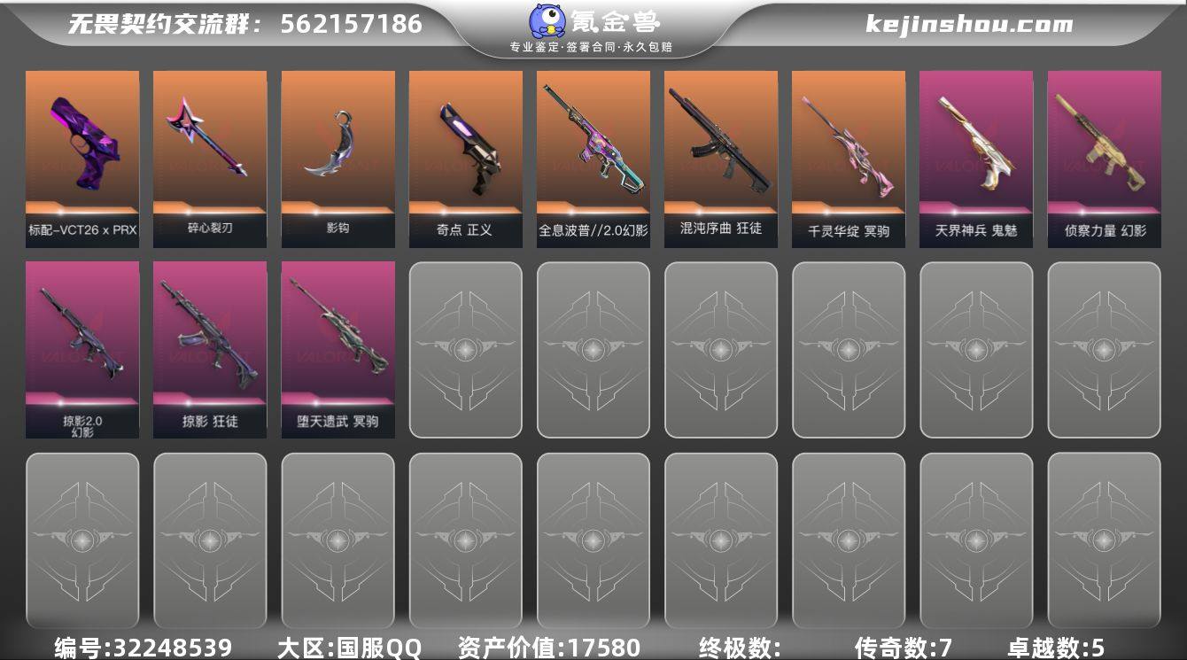 段位: 铂金 近战武器皮肤: 影钩-掠影2.0,碎心裂刃 步枪皮肤: 幻影-侦察力量,幻影-全息波普//2.0,狂徒-混沌序曲,狂徒-掠影,幻影-掠影2.0 佩枪皮肤: 正义-奇点,鬼魅-天界神兵,标配-VCT26 x PRX 狙击枪皮肤: 冥驹-堕天遗武,冥驹-千灵华绽 亮点: 【优质装备】:正义-奇点,冥驹-千灵华绽,狂徒-混沌序曲,狂徒-掠影,幻影-侦察力量,冥驹-堕天遗武,幻影-全息波普//2.0,鬼魅-天界神兵,影钩