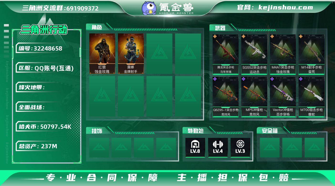 总资产:237.6M,哈夫币:5079W,传说武器8,史诗武器8,武器皮肤129;烽火60级:黑鹰Ⅰ,战场:暂无段位,【安全箱】进阶安全箱;【特勤处等级】仓库LV.8,靶场LV.4,训练中心LV.3,收藏室LV.1,潜水中心LV.1;【捆绑包2】蚀金玫瑰捆绑包,缄花捆绑包;【干员皮肤2】红狼蚀金玫瑰,露娜金牌射手;【近战皮肤1】近战武器-黑鹰;【步枪皮肤55】M4A1突击步枪-蚀金玫瑰,SG552突击步枪-运动员,腾龙突击步枪-马年祥瑞,K416突击步枪-阿萨拉特攻,K416突击步枪-冬日风情,M7战斗步枪-百步穿杨,SG552突击步枪-深海恐惧,SCAR-H战斗步枪-囚徒,G3战斗步枪-哈夫克警备,G3战斗步枪-流沙送葬,ASVal突击步枪-百步穿杨;【冲锋枪皮肤23】MP5冲锋枪-竞技风,Vector冲锋枪-百步穿杨,MP7冲锋枪-六套之力;【射手步枪皮肤16】M14射手步枪-蛮荒,M14射手步枪-缄花,SR-25射手步枪-缄花,VSS射手步枪-丛影谍踪,M14射手步枪-工业狂潮,M14射手步枪-航天庆典;【狙击步枪皮肤9】M700狙击步枪-蝮蛇,M700狙击步枪-哈夫克警备,M700狙击步枪-百步穿杨,AWM狙击步枪-流沙送葬;【轻机枪皮肤9】M249轻机枪-丛影谍踪,QJB201轻机枪-炽焰;【手枪皮肤11】.357左轮-缄花,G18-马年祥瑞,沙漠之鹰-曙光;【挂饰18】狻猊,黄金视野,赤霄游龙,挂饰-蚀金玫瑰,仪典匕首,挂饰-雪人,汤圆,北非蛋,饺子,挂饰-卡皮巴拉,马到成功,挂饰-缄花,暗行哨兵,崩岩重炮,福禄,聚宝盆;【载具10】轮式突击炮-巅峰竞赛,M1A4坦克-巅峰竞赛,侦察直升机-酒红,M1A4坦克-烟火2026,GTQ35坦克-烟火2026,突击车-寒梅,轮式突击炮-烟火2026,F45A战斗机-夜间迷彩,侦察直升机-烟火2026,F-45A战斗机-建造;【烽火地带战损比】0.9/1.7/1.3;【货币】36三角币,360三角卷