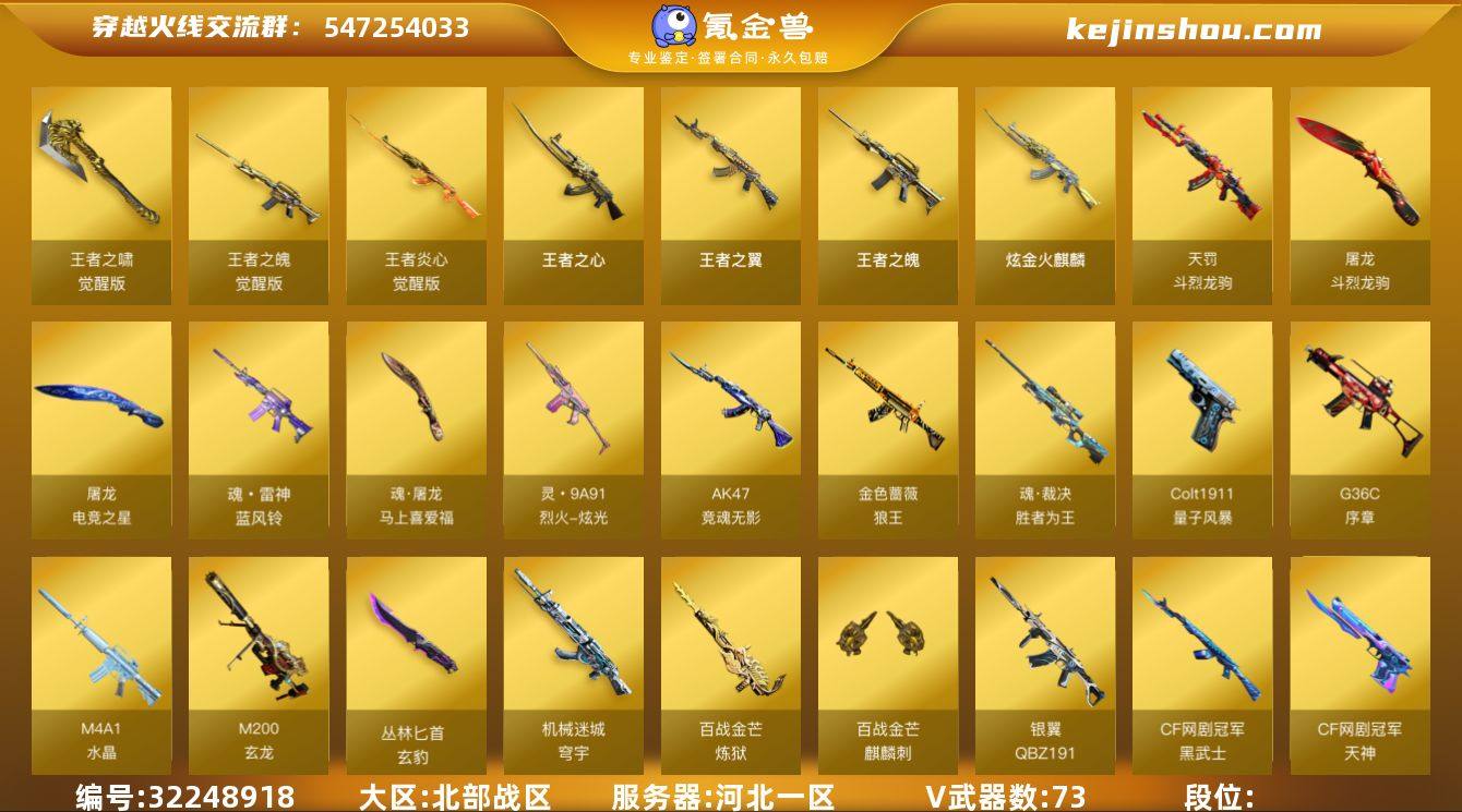 北部战区(河北一区)【北部生化爆破号】传说【传说光耀】73v【M200-幻神,竞技荣光套装,Scar Light-白虎套/暗星,CF网剧冠军武器套装,QBZ191-银翼,HK417-朱雀,QBZ03-金色蔷薇,4烈龙+死亡之眼,AA-12-雷霆】6王者【王者炎心,王者之心,王者之翼,王者之魄,王者之啸】1炫金【炫金火麒麟】10角色【电竞教官-云悠悠,王者-瞳-闭月羞花,玄豹,不败狙神,零-纪元,幻面灵狐,葵-阿尔法武装,乔伊教练,修道士】9音效【M4A1-雷神音效卡,M4A1-黑骑士音效卡,Barrett-碧霄极光音效卡,AN94-竟魂超新星音效卡,屠龙-电竞之星音效卡,炼狱-百战金芒,白虎-盛典舞庆-音效卡,柯尔特-百战金芒音效卡,】15皮【毁灭-星空,火麒麟-雷神,屠龙-破浪逐光,火麒麟-AG战队】截图展示段位不代表实际段位 如赛季更新等不可抗拒因素发生变化、时限道具不保证所剩时间