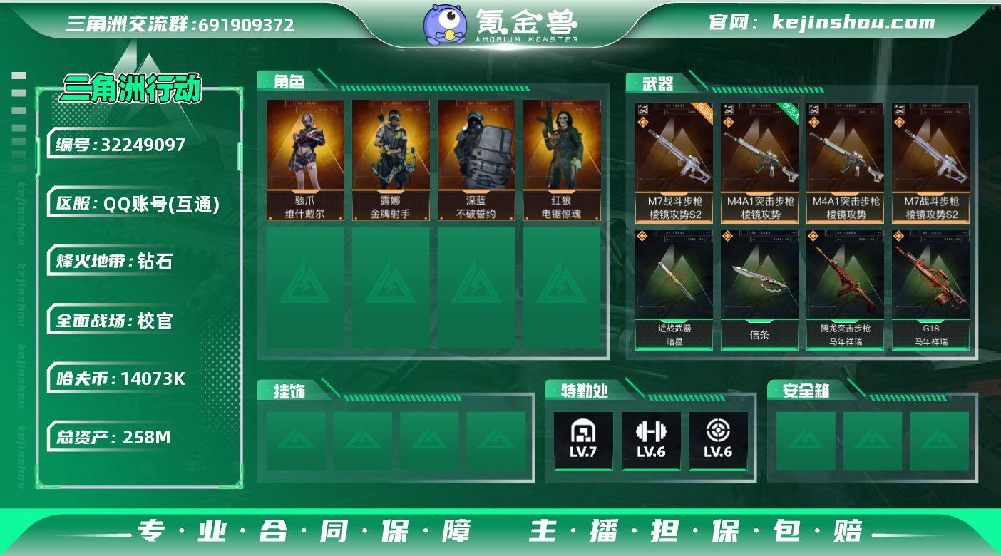 2497675【烽火60级,总资产258M,现金14M,81发AWM,收藏室价值78M展柜44-64有非洲之心,红狼电锯惊魂+不破誓约+金牌射手+维什戴尔+暗星+信条+优品A棱镜M4+极品S石榴紫棱镜M7,体6负6仓库7,0封禁单红双刀双砖皮肤号】 【干员外观】:骇爪-维什戴尔,深蓝-不破誓约,红狼-电锯惊魂,露娜-金牌射手 【近战皮肤】:近战-暗星,近战-信条,近战-黑鹰 【典藏外观】:M4A1突击步枪-棱镜攻势,M7战斗步枪-棱镜攻势S2 【典藏外观成色】:M4A1突击步枪-棱镜攻势(优品A),M7战斗步枪-棱镜攻势S2(极品S) 【传说外观】:AUG突击步枪-悠然茶歇,SG552突击步枪-运动员,SCAR-H战斗步枪-启航,AS Val突击步枪-死神玫瑰,腾龙突击步枪-马年祥瑞,KC17突击步枪-电锯惊魂,MK47突击步枪-悠然茶歇,P90冲锋枪-信条,UZI冲锋枪-悠然茶歇,M250通用机枪-骑士之心,M14射手步枪-缄花,SKS射手步枪-骑士,SR-25射手步枪-信条,SR-25射手步枪-缄花,R93狙击步枪-维什戴尔,.357左轮-缄花,G18-马年祥瑞 【史诗外观】:ASh-12战斗步枪-无极限,K416突击步枪-冬日风情,K416突击步枪-阿萨拉特攻,M7战斗步枪-百步穿杨,G3战斗步枪-流沙送葬,G3战斗步枪-哈夫克警备,AS Val突击步枪-百步穿杨,K437突击步枪-守护者,MP5冲锋枪-战术竞备,MP5冲锋枪-竞技风,Vector冲锋枪-猎鳄行动,Vector冲锋枪-百步穿杨,MP7冲锋枪-守护者,MP7冲锋枪-六套之力,PKM通用机枪-蝮蛇,QJB201轻机枪-炽焰,Mini-14射手步枪-守护者,M700狙击步枪-蝮蛇,M700狙击步枪-百步穿杨,AWM狙击步枪-无极限,AWM狙击步枪-流沙送葬,沙漠之鹰-曙光,复合弓-守护者 【稀有外观】:UZI冲锋枪-旧梦,SG552突击步枪-巨兽,M4A1突击步枪-零点,M4A1突击步枪-繁盛,AKM突击步枪-战术演练,AKM突击步枪-肃杀,ASh-12战斗步枪-繁盛,K416突击步枪-碳纤维,K416突击步枪-一帆风顺...