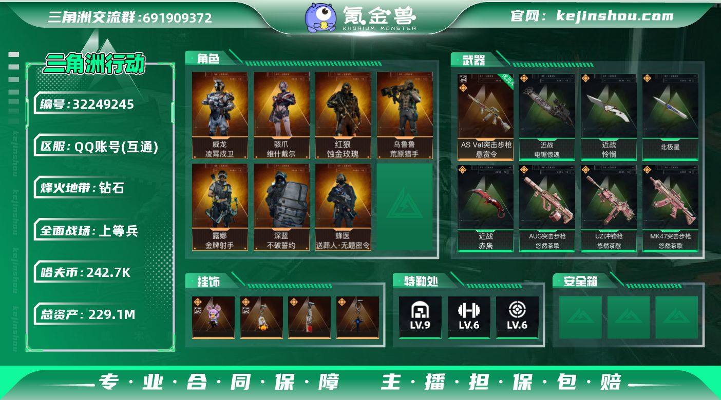 实名:可二次实名 总资产:229.1M 哈夫币:242.7K 烽火地带段位:钻石 烽火地带等级:60 全面战场段位:上等兵 全面战场等级:25 9级仓库,6级训练中心,6级靶场,5级指挥中心,1级潜水中心,3级防具台,3级工作台,3级制药台,3级技术中心,1级收藏室 战术部门等级:3 战斗部门等级:2 医疗部门等级:2 研发部门等级:1 后勤部门等级:2 曼德尔砖-气象感应:0 曼德尔砖-命运王牌:0 曼德尔砖-电玩高手:0 曼德尔砖-美杜莎:0