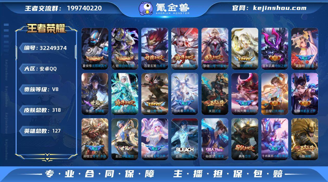 V8 2典藏 23传说 127英雄 318皮肤 可修改实名 男号 【英雄全皮】李信全皮,夏洛特全皮,大禹全皮 【稀有英雄】大司命,嬴政(始皇帝),韩信(韩跳跳),夏洛特(夏师傅),艾琳,橘右京(橘子),娜可露露(鸟人),不知火舞,赵云,金蝉(唐僧),戈娅 【荣耀水晶】银白咏叹调(倪克斯侍卫),无限飓风号(高达) 【传说皮】幻光神枪,山海·炽霜斩(李信年限),零号·赤焰,仲夏夜之梦(大飞蛾),地狱之眼,一念神魔,淬星耀世,云鹰飞将(小将军),炽阳神光,末日机甲-孙策,浮生妄 【珍宝阁皮】妄想食味,蔷薇恋人,女武神 【赛季/战令皮】噬灭天穹(s37),古海寻踪(s33),星界游侠,海盐诗旅(s30),擒涛扼浪(s31),潮玩骑兵,奇幻香踪,探海日志(s32),流音漫舞,顽趣-梦奇,地狱燃心,剑破天穹(s35),天穹祈灯(s34),天穹之誓(s36),暖冬·兔眠,狰(s8),饕餮(s9),烛龙(s10),重明(s11),穷奇(s12),御狮(s13),御旌(s15),朔风刀(s17),混沌棋(s18),疑决卦(s19),醍醐杖(s20),原初探秘者(s21),万华元夜(s22),演武夺筹(s23),驱傩正仪(s24),千军破阵(s25),星空之诺,银河之约,西部大镖客-猪八戒,暗影游猎(游乐娃子),单词大作战,狂想玩偶喵,潮玩骑士王,云间偶戏,星际陆战队-达摩,胡桃异想国,圣弓游侠,真爱魔法,火炮绅士,沙漠行僧(s26),幻夜卜梦,金...