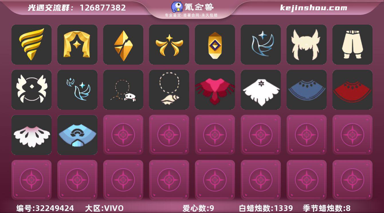 蜡烛数量:1339 爱心数量:9 季节蜡烛数量:8 翼数量:11 潜海季,表演季,破晓季,欧若拉季,追忆季,青鸟季 蟑螂斗,白鸟斗,黑金,红金,樱花斗,暗彩斗 白枭 武士裤 青鸟毕业面饰 青鸟毕业项链,螃蟹肩饰,海螺项链 卖家说:【白枭➕小王子围巾➕欧若拉毕业礼,潜海季➕表演季➕破晓季➕欧若拉季➕追忆季➕青鸟季】全图基本毕业,热门斗篷发型,急出,本人正常学生作息时间在线