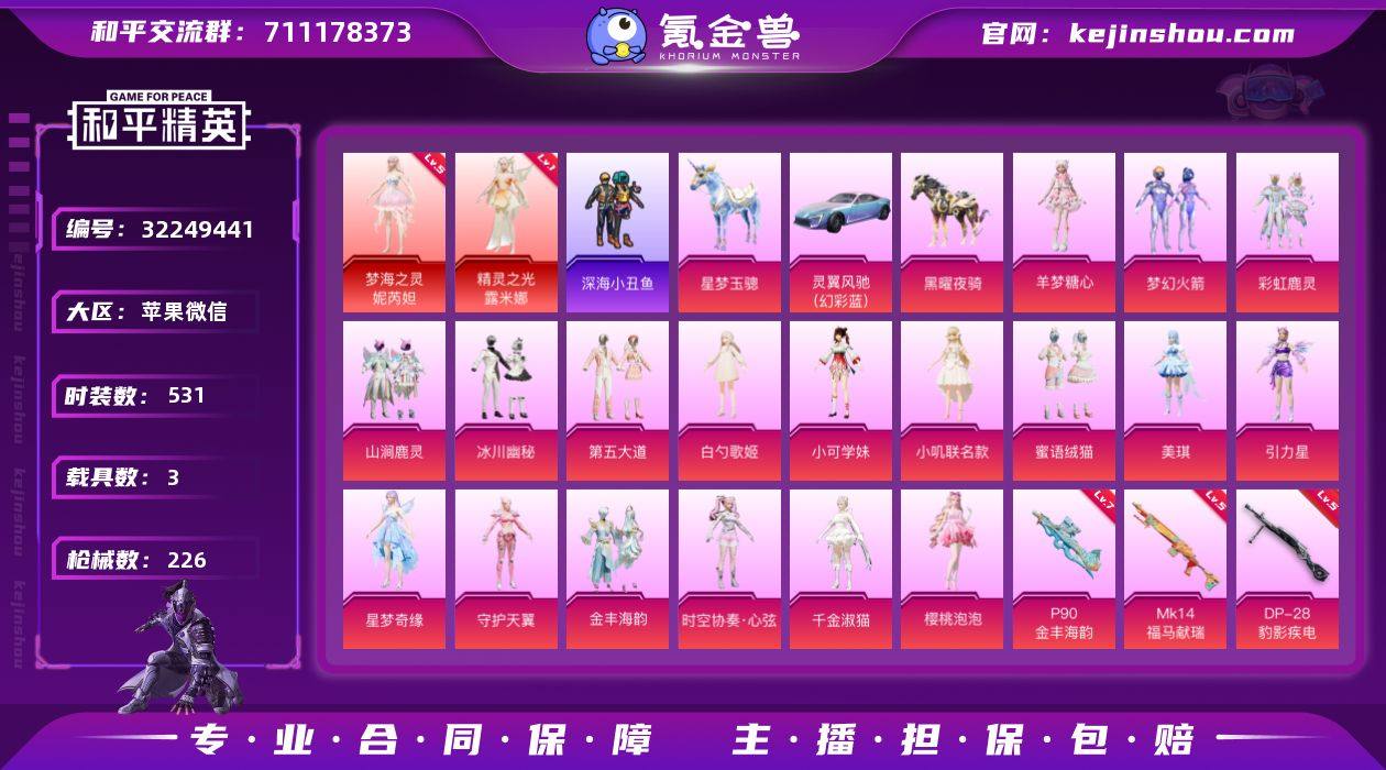 xy裙子号【90918热力值】【10王牌】【18粉装16特效枪3载具2红装】570物资币, 【热门】一级精灵之光-露米娜,五级梦海之灵-妮芮妲,雪山精英,兔兔小魔女,糯粉咩咩 【载具】黑曜夜骑,星梦玉骢,灵翼风驰(幻彩蓝), 【粉装】梦幻火箭,第五大道,羊梦糖心,BEARBRICK,时空协奏·心弦,金丰海韵,守护天翼,星梦奇缘,引力星,美琪,蜜语绒猫,小叽联名款,小可学妹,白勺歌姬,冰川幽秘,山涧鹿灵,彩虹鹿灵,千金淑猫,樱桃泡泡 【特效枪】四级Vector-绯穹魔姬,七级P90-金丰海韵,五级Kar98K-巳巳如意,五级M416-电玩时刻,三级AKM-幽焰骑士,三级GROZA-精灵之光,三级平底锅-林间仙鹿,二级DP-28-千金淑猫,二级M200-梦海之灵,二级PKM-守护天翼,二级UMP45-宇宙意志,一级M417-第五大道,五级DP-28-豹影疾电 【背包】恐龙拽拽背包(2级),赞萌露比背包(2级),赞萌露比背包(3级) 【头盔】 【优质战备】桃粉嫣然降落伞,樱桃泡泡降落伞,晶梦幻蝶降落伞,幽焰骑士降落伞,千金淑猫降落伞,蜜语绒猫降落伞,镜域双华-灵镜之阶,镜域双华降落伞,巴啦啦小魔仙飞行器,巴啦啦小魔仙降落伞,精灵梦叶罗丽降落伞,绮梦流光降落伞,守护天翼降落伞,圣堂之誓降落伞,星梦奇缘降落伞,星梦奇缘飞行器,金丰海韵降落伞,深渊漩涡飞行器,拳皇·狂花道降落伞,曦光华影飞行器,精灵之光降落伞,林间仙鹿降落伞,垂柳戏鸭降落伞,冰川粉黛降落伞,第五大道降落伞 截图展示段位不代表实际段位 如赛季更新等不可抗拒因素发生变化、时限道具不保证所剩时间