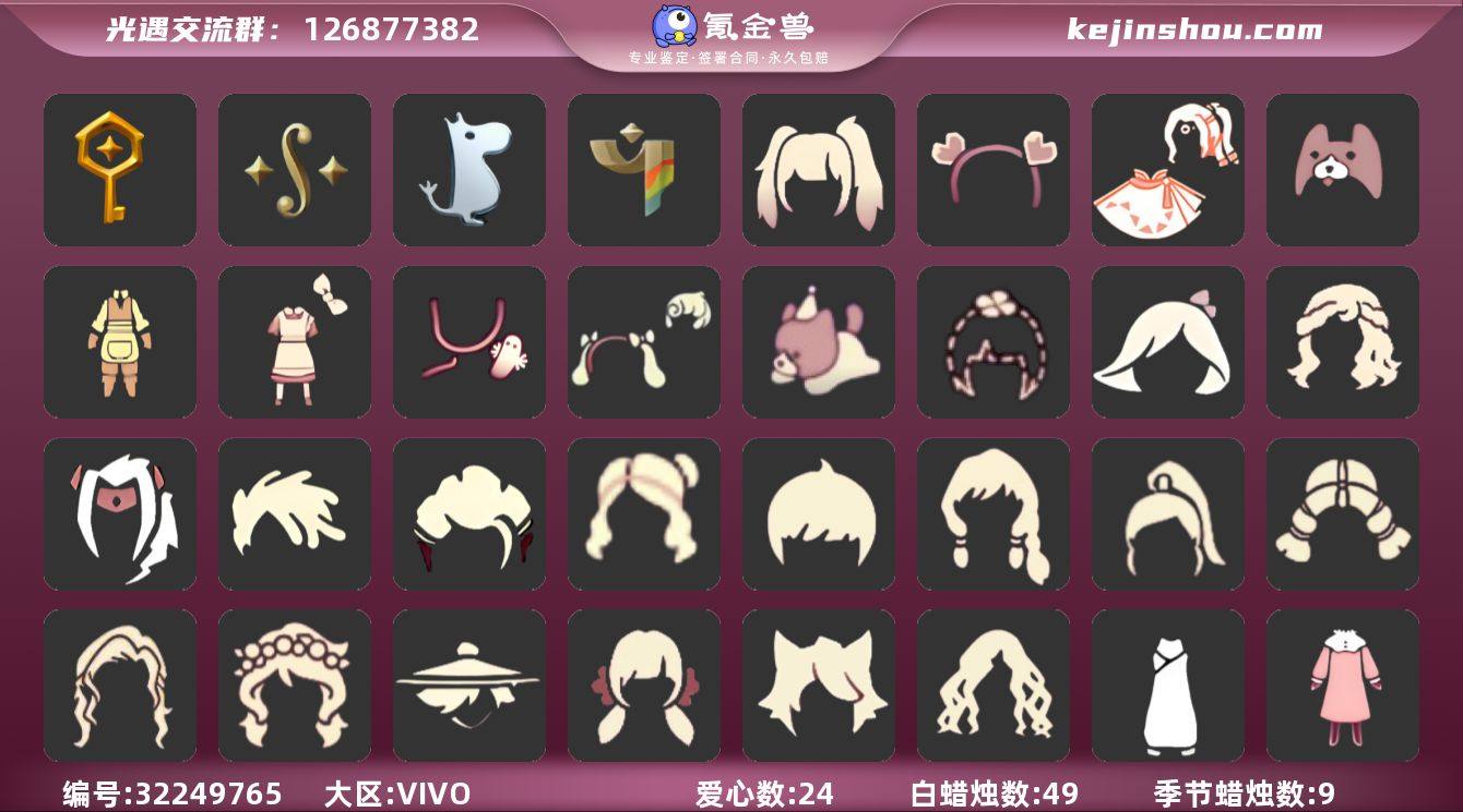 蜡烛数量:49 爱心数量:24 季节蜡烛数量:9 翼数量:97 筑巢季,二重奏季,姆明季,彩染季 姆明季·斗篷,筑巢季·斗篷,归巢围巾斗,绿芽,万圣斗,海洋斗,樱花斗,紫罗兰斗,郁金香斗,马蹄莲斗,蓝浴巾 马蹄莲发型,海蓝波浪发型,冥龙长辫,脏辫发型,总裁发型,公主,正太,书虫,高马尾,粗辫,虚荣,花环,若笠,樱花,猫耳,女巫 姆明季·裤子,妮妮裙子,武士裤,搓澡巾,花臂抹胸裙,花臂蓝色裤,小灰裙 粽叶发带面具,玫瑰面具,蛇年面具,星绘面具 青鸟毕业面饰,蔚蓝眼镜 星星奖杯,书架柜子,口琴,姆明季帐篷,小红伞,姆明抱枕,姆明全家福,钢琴键横挂画,筑巢季·小手办,笛子,玉桂狗茶桌,帐篷,万圣椅,爱心抱枕,遥鲲泳圈,大提琴,彩色大提琴,浅色地毯,深色地毯,大提琴挂画,钢琴挂画,波浪琴键挂画,海螺挂画,二重奏挂画 青鸟尊贵蓬头耳机,青鸟怀旧火花发饰,青鸟盛装彩纸发饰,黄色蝴蝶结,紫色魔法帽,猫猫头套 青鸟毕业项链,彩染季项链,姆明季围巾,铃铛,二重奏季项链 姆明季·鞋子 渐变双马尾发型礼包,心心相印发饰礼包,衔福献瑞礼包,小狗周年发饰,园丁装扮,爱丽丝围裙套装礼包,树精肩饰,大耳狗装扮,奥利奥,四叶草 卖家说:园丁装扮,爱丽丝裙子,巫师帽,蝙蝠斗,神鹿角,兔子拖鞋,巫树角,树精肩饰,大耳狗发饰,大耳狗斗篷,双马尾,新春扇子,皮皮猫套装,雪花发夹,兔子头饰,蓝色音乐会,奥利奥头饰,四叶草头饰,创始人斗篷,衔福献瑞斗篷,海洋发型