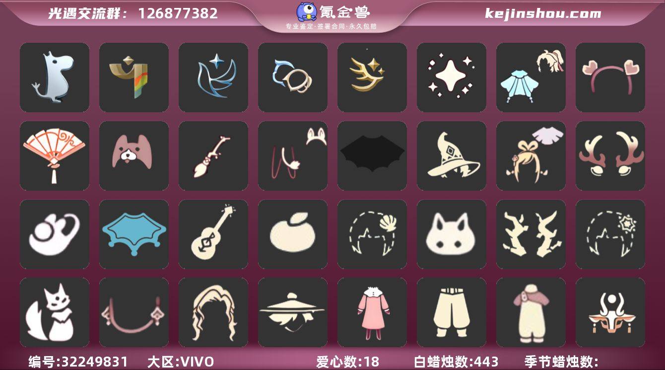 账号类型: 手机账号 季节已毕业: 姆明季,彩染季,青鸟季,双星季,迁徙季 完成地图: 晨岛,云野,雨林,霞谷 礼包: 蝙蝠套,巫师,绊爱,鹿角,兔子鞋,瑞雪,吉他,橘子,贝壳,兔子,枯角,雪花,猫背饰,新年耳钉,姆明饰品套装,恶作剧飞行扫帚,献瑞折扇礼包,心心相印发饰礼包,小狗周年发饰,青衫落拓礼包,记忆水晶礼包 裤子: 武士裤,背带裤,妮妮裙子 面具: 辉光羚羊面具 面饰: 红耳机,青鸟毕业面饰 发型: 若笠,虚荣 头饰: 蓝色音乐会,平顶帽 斗篷: 瑞雪斗篷,彩染围巾斗篷,青鸟毕业斗篷 配饰: 雨伞,高音钢琴,姆明抱枕,小红伞 亮点: 【优质装备】:晨岛,云野,雨林,霞谷,若笠(箬笠),武士裤,高音钢琴(白色高脚钢琴),妮妮裙子(妮妮长裙),姆明抱枕,小红伞(姆明红伞)(姆明大伞),姆明季,辉光羚羊面具,彩染季,青鸟季,青鸟毕业面饰(青鸟面饰),青鸟毕业斗篷(青鸟斗篷),双星季,蝙蝠套(蝙蝠斗篷)(南瓜头),绊爱(绊爱斗篷)(绊爱礼包),恶作剧飞行扫帚,红耳机,鹿角(圣诞鹿角),瑞雪(瑞雪斗篷)(暖冬瑞雪),吉他(音韵吉他)(白吉他),姆明饰品套装(姆明尾巴),巫师(巫师帽),枯角(巫树犄角),猫背饰(猫咪背饰),兔子鞋(兔子拖鞋),献瑞折扇礼包,小狗周年发饰(小狗周年头饰),青衫落拓礼包,兔子(玉兔头饰)(玉兔发饰)(兔子发饰),心心相印发饰礼包,雪花(雪花发夹),新年耳钉(金鳞耳饰),橘子(大橘大利),贝壳(贝壳发饰)