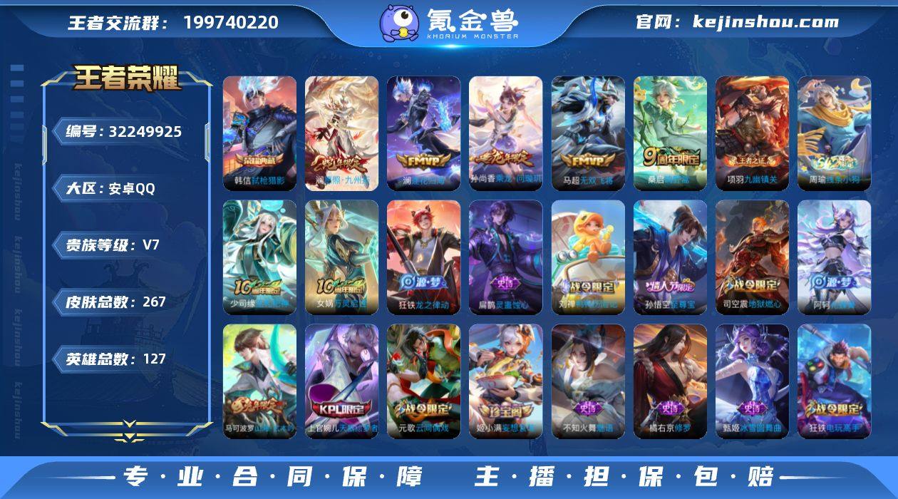 AHC71621 安卓Q-V7-至尊星耀II段位-127英雄-267皮肤-1典藏皮肤-5传说-80史诗 【英雄全皮】:敖隐全皮,戈娅全皮,空空儿全皮,影全皮 【荣耀典藏】:韩信弑枪猎影 【传说皮肤】:澜愿照九州拓,桑启鸣野蒿,孙尚香乘龙问璇玑,澜逐花归海,马超无双飞将 【限定皮肤】:蒙犽顽岩魄,姜子牙天穹之誓,狄仁杰阴阳师,赵云皇家上将,墨子神迹守卫,孙尚香蔷薇恋人,高渐离玩趣恶龙,阿轲迷踪丽影,钟无艳超时空战士,芈月幻夜卜梦,元歌云间偶戏,元歌无心,夏侯惇朔风刀,甄姬落雪兰心,马可波罗山海玄木吟,狄仁杰魔术师,狄仁杰万华元夜,达摩沙漠行僧,项羽海滩派对,老夫子醍醐杖,老夫子航海奇遇记,程咬金演武夺筹,刘邦夺宝奇兵,韩信逐梦之影,兰陵王金庭之子,亚瑟潮玩骑士王,孙悟空至尊宝,李元芳云中旅人,钟馗驱傩正仪,雅典娜黎明之约,鬼谷子原初探秘者,鬼谷子五谷丰年,黄忠火炮绅士,苏烈千军破阵,百里玄策原初追逐者,弈星混沌棋,梦奇顽趣,沈梦溪大漠名商,明世隐疑决卦,裴擒虎李小龙,裴擒虎擒涛扼浪,狂铁电玩高手,云中君纤云弄巧,猪八戒西部大镖客,上官婉儿天狼绘梦者,嫦娥拒霜思,嫦娥暖冬兔眠,西施玲珑珍味,鲁班大师探海日志,桑启海盐诗旅,暃星界游侠,戈娅驭风魔法,艾琳流音漫舞,司空震地狱燃心,阿古朵江河有灵,张良古海寻踪,蒙恬荣光圣徽,高渐离燃音魔法,妲己灵卜魔法,鬼谷子天穹祈灯,伽罗琥珀纪元,姬小满妄想食味,孙尚香乘龙问璇玑,沈梦溪龙舞盛年,刘邦剑破天穹,周瑜熔金海岸 【年限皮肤】:马可波罗山海玄木吟,孙尚香乘龙问璇玑,澜愿照九州拓 【赛季限定】:夏侯惇朔风刀,弈星混沌棋,明世隐疑决卦,老夫子醍醐杖,鬼谷子原初探秘者,狄仁杰万华元夜,程咬金演武夺筹,钟馗驱傩正仪,苏烈千军破阵,达摩沙漠行僧,兰陵王金庭之子,沈梦溪大漠名商,李元芳...