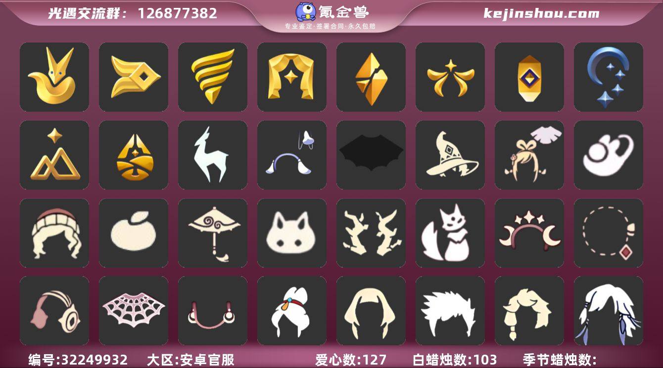 账号类型: 手机账号 季节已毕业: 小王子季,风行季,潜海季,表演季,破晓季,欧若拉季,夜行季,追忆季,拾光季,归巢季,九色鹿季 完成地图: 晨岛,云野,雨林,霞谷,暮土,禁阁 珍稀物品: 白枭,透明蝶翼斗,玫瑰花,彩虹围巾 礼包: 蝙蝠套,巫师,绊爱,兔子鞋,彩虹帽,橘子,红伞,兔子,枯角,猫背饰,星月头饰,彩虹耳钉,彩虹耳机,透明蛛丝,满月耳坠,活力海牛礼包 裤子: 武士裤,搓澡巾,王子服,蓝绿裤,飞天裤 面具: 凤凰面具,呼吸面具,夜行毕业面具,黄眉企鹅面具 面饰: 红耳机,黑框眼镜 项链: 围巾 发型: 归巢毕业发型,若笠,虚荣,单侧绑发,小王子发型,留辫蘑菇头,飞天盘发 头饰: 羽毛发饰,牛仔帽,蓝色音乐会,平顶帽 斗篷: 粉红绒毛斗篷,遥鲲斗篷,燕尾斗篷,冥龙斗篷 配饰: 雨伞,高音钢琴,相机,玫瑰花,鲲灯 亮点: 【优质装备】:表演季,白枭(帝企鹅发),武士裤,小王子季(王子季),风行季,潜海季,破晓季,透明蝶翼斗,欧若拉季(欧若拉),归巢毕业发型(五塑彩羽发),羽毛发饰(多羽发饰),高音钢琴(白色高脚钢琴),玫瑰花,夜行季,追忆季,牛仔帽(西部帽),相机(季卡相机),拾光季,彩虹围巾(五塑彩带斗),归巢季,九色鹿(九色鹿季),王子服(小王子套装),蓝绿裤(高领舞服),飞天裤(柔缎花边连)(九色鹿丝带裤),围巾(肩带),凤凰面具,呼吸面具(潜水面具),夜行毕业面具(棕熊面具),黄眉企鹅面具,黑框眼镜(粗框眼镜),单侧绑发(单边小辫),小王子发型,留辫蘑菇头,粉红绒毛斗篷(绒毛斗篷),遥鲲斗篷(双翼遥鲲斗),燕尾斗篷,冥龙斗篷,鲲灯(追忆之书),飞天盘发(九色鹿丸子头),蝙蝠套(蝙蝠斗篷)(南瓜头),绊爱(绊爱斗篷)(绊爱礼包),红耳机,红伞(瑞气纸伞),透明蛛丝(透明蜘蛛斗),巫师(巫师帽),彩虹帽(多彩绒帽),枯角(巫树犄角),猫背饰(猫咪背饰),彩虹耳机,晨岛,云野,雨林,霞谷,墓土(暮土),禁阁,若笠(箬笠),活力海牛礼包,兔子鞋(兔子拖鞋),星月头饰(星月头冠),兔子(玉兔头饰)(玉...