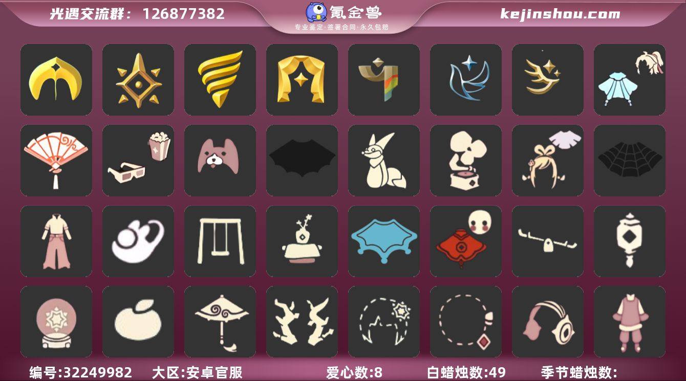 账号类型: 邮箱账号 季节已毕业: 圣岛季,预言季,潜海季,表演季,彩染季,青鸟季,迁徙季 完成地图: 晨岛,云野,雨林,霞谷,暮土,禁阁 珍稀物品: 鳐鲲斗篷,阿努比斯(狗头),白枭 礼包: 蝙蝠套,小狐狸,音乐桌,绊爱,蜘蛛斗,牛仔裤,兔子鞋,秋千,茶桌,瑞雪,福娃,跷跷板,灯笼,雪花球,橘子,红伞,枯角,雪花,彩虹耳钉,彩虹耳机,新年裤,暗彩装扮,爱心眼镜,火焰眼镜,透明蛛丝,新年耳钉,创始人,锦标赛桂冠,优雅三件套,献瑞折扇礼包,小狗周年发饰,青衫落拓礼包,周年影院套餐礼包 裤子: 武士裤,搓澡巾 面具: 阿努比斯,呼吸面具,黄眉企鹅面具,辉光羚羊面具 面饰: 青鸟毕业面饰 发型: 若笠,虚荣,单侧绑发 头饰: 平顶帽 斗篷: 海洋斗,绿芽,燕尾斗篷,彩染围巾斗篷,青鸟毕业斗篷 配饰: 雨伞,高音钢琴,圆鼓,蓝色手碟 亮点: 【优质装备】:预言季,阿努比斯(狗头),表演季,白枭(帝企鹅发),武士裤,圣岛季,潜海季,鳐鲲斗篷,高音钢琴(白色高脚钢琴),呼吸面具(潜水面具),黄眉企鹅面具,单侧绑发(单边小辫),燕尾斗篷,圆鼓(手拍大鼓),蓝色手碟(毕业手碟),辉光羚羊面具,彩染季,青鸟季,青鸟毕业面饰(青鸟面饰),青鸟毕业斗篷(青鸟斗篷),蝙蝠套(蝙蝠斗篷)(南瓜头),福娃(福娃礼包)(春之日礼包)(铜钱斗),音乐桌(网易云留声机),绊爱(绊爱斗篷)(绊爱礼包),秋千(情人秋千),茶桌(花憩茶桌),跷跷板(情人跷跷板),蜘蛛斗(蛛丝斗篷)(蛛网斗篷),瑞雪(瑞雪斗篷)(暖冬瑞雪),灯笼(中秋灯笼),红伞(瑞气纸伞),暗彩装扮(彩虹武士裤),透明蛛丝(透明蜘蛛斗),优雅三件套(西装套装),小狐狸(狐狸背包),牛仔裤(阔腿牛仔),雪花球(雪花水晶球),枯角(巫树犄角),彩虹耳机,新年裤(瑞气服饰),晨岛,云野,雨林,霞谷,墓土(暮土),禁阁,若笠(箬笠),兔子鞋(兔子拖鞋),爱心眼镜,创始人(创始人斗篷),锦标赛桂冠,献瑞折扇礼包,小狗周年发饰(小狗周年头饰),青衫落拓礼包,周年影院套餐礼包,彩虹耳钉...