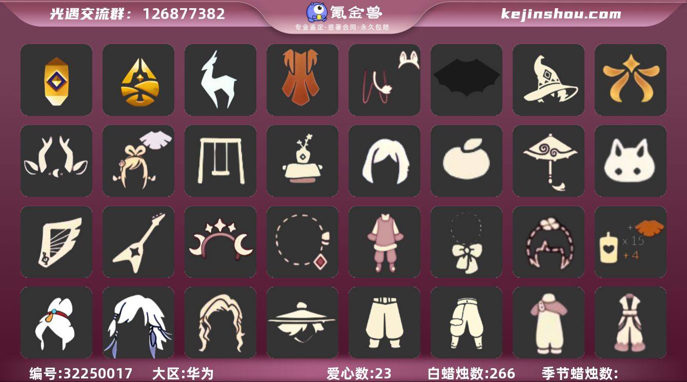 账号类型: 手机账号 季节已毕业: 追忆季,归巢季,九色鹿季 珍稀物品: 彩虹围巾 礼包: 蝙蝠套,巫师,欧若拉之翼,九色鹿角,绊爱,秋千,茶桌,奔跑发型,橘子,红伞,兔子,竖琴,电吉他,星月头饰,彩虹耳钉,新年裤,蝴蝶结,四叶草,创始人,姆明饰品套装,奉献斗篷 裤子: 武士裤,背带裤,搓澡巾,飞天裤 面具: 夜行毕业面具,黄眉企鹅面具 面饰: 红耳机,黑框眼镜 项链: 围巾 发型: 归巢毕业发型,若笠,虚荣,飞天盘发 头饰: 牛仔帽,平顶帽 斗篷: 奉献斗篷 配饰: 雨伞,鲲灯 亮点: 【优质装备】:归巢毕业发型(五塑彩羽发),若笠(箬笠),武士裤,追忆季,牛仔帽(西部帽),彩虹围巾(五塑彩带斗),归巢季,九色鹿(九色鹿季),飞天裤(柔缎花边连)(九色鹿丝带裤),围巾(肩带),夜行毕业面具(棕熊面具),黄眉企鹅面具,黑框眼镜(粗框眼镜),鲲灯(追忆之书),飞天盘发(九色鹿丸子头),蝙蝠套(蝙蝠斗篷)(南瓜头),电吉他(周年电吉他),欧若拉之翼,绊爱(绊爱斗篷)(绊爱礼包),秋千(情人秋千),茶桌(花憩茶桌),红耳机,九色鹿角(神鹿祝福头饰)(神鹿祝福礼包),红伞(瑞气纸伞),奉献斗篷,姆明饰品套装(姆明尾巴),巫师(巫师帽),新年裤(瑞气服饰),竖琴(雏鸟之琴),星月头饰(星月头冠),蝴蝶结(大蝴蝶结),创始人(创始人斗篷),奔跑发型(奔离远行发),兔子(玉兔头饰)(玉兔发饰)(兔子发饰),彩虹耳钉(彩虹耳饰),橘子(大橘大利),四叶草(四叶草头饰)
