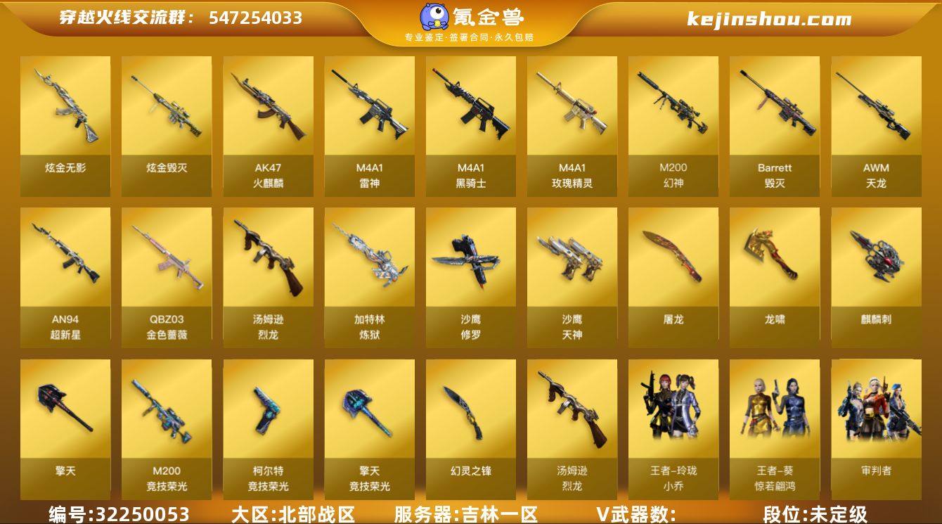 广东一区-37V-3王者武器数-0炫金武器数 【传说武器】:传说辉光 【热门武器】:传说辉光,HK417-朱雀,M200-幻神,死亡之眼,白虎-电玩蓝兔,柯尔特-冠军之特*2,金色小号,M4A1-黑骑士,沙鹰-修罗,Knife-冠军之刃 【音效卡】:屠龙-动感闪耀 音效卡,M200-幻神音效卡,M4A1-黑骑士音效卡,Barrett-毁灭音效卡,Scar Light-白虎音效卡,绝迹语音包,Barrett-碧霄极光音效卡 【皮肤】:幻神-巅峰荣耀,雷神-冠军之魄,火麒麟-冠军之心,火麒麟-盘古,毁灭-CFS2020,毁灭-黑大圣皮肤,黑骑士-冠军之势,无影-能量核心,战神-粉色甜心皮肤*3,战神-紫绶金章皮肤*2,战神-流金岁月皮肤,AK47-B-常胜将军-曹操*3,AK47-B-常胜将军-刘备,AK47-B-常胜将军-孙权*2,AWM-天龙-传奇70KG,AWM-天龙-传奇白鲨,龙啸-冠军之啸 【角色】:审判者,王者-葵-貂蝉,王者-零,乔伊教练,芳心审判者,风暴女,嘉年华灵狐,灵动武士,龙儿-小淘气,潘多拉-X,潘多拉-甜心教官,蜀雪,兔囡囡,职业选手 【人偶武器】:AWM-灵狐-15周年嘉年华,海滩汪汪-巴雷特,COP-旗袍,迷你深渊冰龙,夺魂,迷你生化手雷,深渊终结者手雷,闪光弹-貂蝉,高爆手雷-大乔,迷你艾比,迷你超能女侍,灵狐娃娃手雷*2 【暴走生化】:死亡之眼,超级对讲机 【挑战大师】:AK47-冰龙粉碎者 【英雄级武器】:AK47-火麒麟,M4A1-雷神,M4A1-黑骑士,AK47-黑武士,AK47-黑鲨,HK417-朱雀,M4A1-玫瑰精灵,烈火-动感闪耀,AK47-B-战神,AK47-B-常胜将军,白虎-电玩蓝兔,AWM-天龙,Barrett-毁灭,AWM-裁决,M200-幻神,王者星神-觉醒版,沙鹰-修罗,柯尔特-冠军之特*2,天神-动感闪耀,屠龙*4,龙啸,屠龙-动感闪耀,王者之锋-觉醒版,王者之击-觉醒版,手雷-动感闪耀 【道具】:BS战队炫彩背包,超级背包,女皇终结者-魔龙之吻,绿色巨人,夺命之镰,防化服*2...