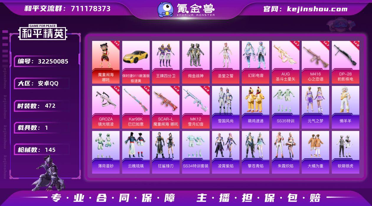 实名: 可修改 时装数: 472 载具数: 1 枪械数: 145 战备数: 1 神级装扮: 魔童闹海-哪吒 热门装扮: 绚金战神,王牌四分卫,大橘为重,软萌银虎,圣堂之誓,幻彩电音 载具: 保时捷911敞篷版(极速黄) 稀有枪皮: M416心之恋语,GROZA-镜光银凌,Kar98K-巳巳如意,MK12-雪月幻音,AUG-圣斗士星矢,DP-28-豹影疾电,SCAR-L-魔童闹海 哪吒 亮点: 【优质装备】:魔童闹海-哪吒,一级魔童闹海-哪吒(1级哪吒),七级M416-心之恋语,七级AUG-圣斗士星矢