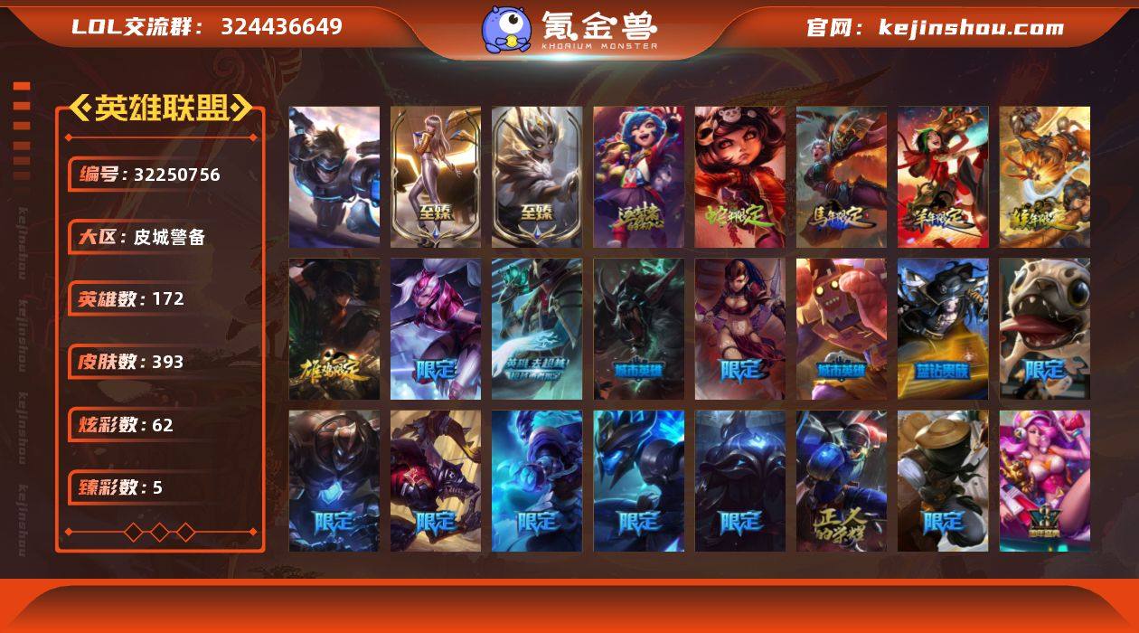 【LD5216】172英雄/393皮肤/1终极/4神话/75限定/5臻彩/62炫彩/40传说/107史诗/黄金账号等级:571/10周年 安妮/至臻 K/DA 卡莎/至臻 魔女 婕拉/至臻蒙面女郎莫甘娜/天龙之子 卡莎 飞龙乘云/星之守护者 金克丝 黑洞/魔女 阿卡丽 虚荣/净雪之月 莫甘娜 冬虹/水晶玫瑰 迦娜 甜蜜花蕾/“你看见过我的熊猫吗?” 安妮/替父从军 花木兰/神龙烈焰 金克丝/美猴王 孙悟空/虎痴之拳 蔚/龙马烈焰波比/觅心猫猫 悠米/水晶玫瑰 迦娜/幸福女神 乐芙兰/圣诞精灵 崔丝塔娜/圣诞狂欢 努努/邪恶圣诞老人 维迦/冰雪节 茂凯/雪默丁格/圣诞玩偶 波比/圣诞驯鹿 克格莫/冰雪女神 辛德拉/冰雪兽 纳尔/未来战士/养蜂人 辛吉德/地底世界 崔斯特/冠军典狱长 锤石/冠军之矛 卡莉丝塔/冠军之隐 劫/S1FNC 迦娜/S2 暗杀星 发条/S2 暗杀星 蒙多/S2 暗杀星 努努/S2 暗杀星 慎/S2 暗杀星 伊泽瑞尔/S3 SKT T1 贾克斯/S3 SKT T1 劫/S3 SKT T1 婕拉/S3 SKT T1 李青/S3 SKT T1 薇恩/S4 SSW 炼金/S4 SSW 图奇/S4 SSW 泰隆/S4 SSW 雷恩加尔/S4 SSW 锤石/S5 SKT T1 阿利斯塔/S5 SKT T1 阿兹尔/S5 SKT T1 滑板鞋/S5 SKT T1 雷克顿/S5 SKT T1 瑞兹/S5 SKT T1 蜘蛛/S6 SKT T1 娜美/S7 SSG 嘉文四世/S11 EDG 佛耶戈/3周年 厄运小...