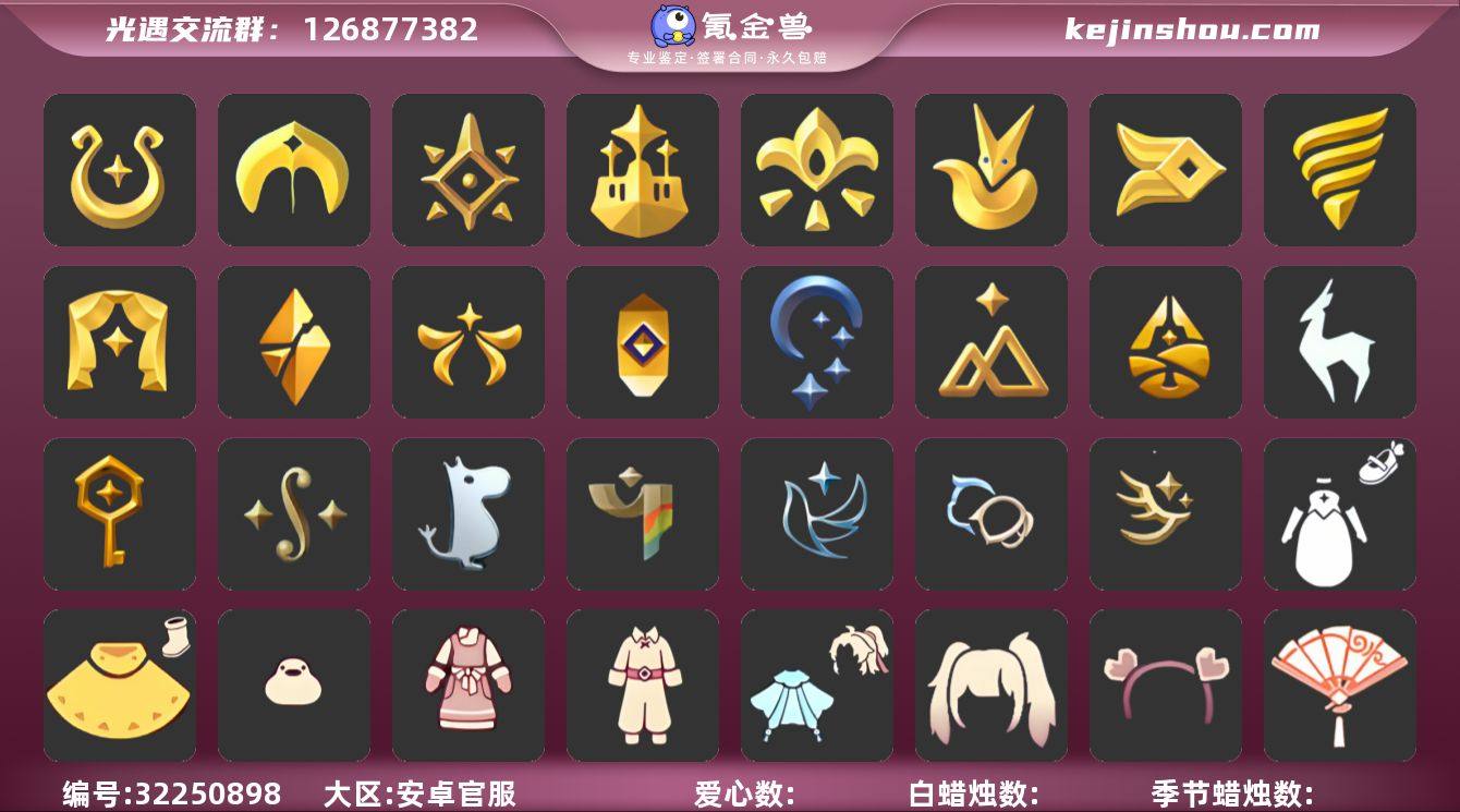 账号类型: 手机账号 季节已毕业: 魔法季,圣岛季,预言季,梦想季,小王子季,风行季,潜海季,表演季,破晓季,欧若拉季,集结季,夜行季,追忆季,拾光季,归巢季,九色鹿季,筑巢季,二重奏季,姆明季,彩染季,青鸟季,双星季,迁徙季 完成地图: 全图毕业 珍稀物品: 鳐鲲斗篷,阿努比斯(狗头),白枭,透明蝶翼斗,魔法季耳坠,周年电吉他,玫瑰花,咖喱,彩虹围巾 礼包: 蝙蝠套,巫师,围巾,星球斗,小狐狸,欧若拉之翼,九色鹿角,莲花斗,大耳狗抱枕,大耳狗装扮,大耳狗服饰,绊爱,大铁头,鹿角,荷叶伞,蜘蛛斗,牛仔裤,兔子鞋,大耳狗发饰,肯德基联动,运动鞋,秋千,茶桌,茶壶,餐桌,白绒金,瑞雪,女巫裙,福娃,跷跷板,小船,吉他,灯笼,风之旅人,奔跑裤子,致爱装扮,人声乐器,奔跑发型,鲤鱼套,彩虹帽,雪花球,绒帽,橘子,粽叶,贝壳,黄伞,红伞,兔子,南瓜,枯角,雪花,鲤鱼,竖琴,手碟,电吉他,tgc,水母,猫套,猫背饰,星月头饰,彩虹耳钉,彩虹耳机,雪怪斗,球赛门,新年裤,蝴蝶结,魔法棒,奥利奥,海螺,四叶草,暗彩装扮,向日葵套,小提琴,拖鞋,滑板,爱心眼镜,火焰眼镜,伯爵斗篷,透明蛛丝,伯爵面具,飞蛾套,文雀套,雪人鞋,夹袄斗,新年耳钉,龙纹斗,浪漫流星斗,创始人,海蓝波浪发型,飞鸟纸伞,彩虹泡泡机,日光耳环,遥鲲披肩斗篷,满月耳坠,月华套装,锦标赛短袍,锦标赛桂冠,线框斗,优雅三件套,姆明饰品套装,史力奇套装,史力奇帽子,树精肩饰,恶作剧飞行扫帚,恶作剧鸦羽斗篷,向日葵连衣裙,蛛网朋克,龙鳞束身长袍,仙境茶会门扉礼包,爱丽丝围裙套装礼包,进行曲制服,妮妮斗篷,海龟斗篷,园丁装扮,衔福献瑞礼包,献瑞折扇礼包,渐变双马尾发型礼包,心心相印发饰礼包,小狗周年发饰,篝火点心礼包,奉献斗篷,宝藏猎人礼包,必胜客联动装扮礼包,青衫落拓礼包,小黄鸭雨衣套装礼包,小黄鸭发饰礼包,周年礼包 裤子: 武士裤 面具: 阿努比斯 面饰: 魔法季耳坠,黑框眼镜 发型: 白枭