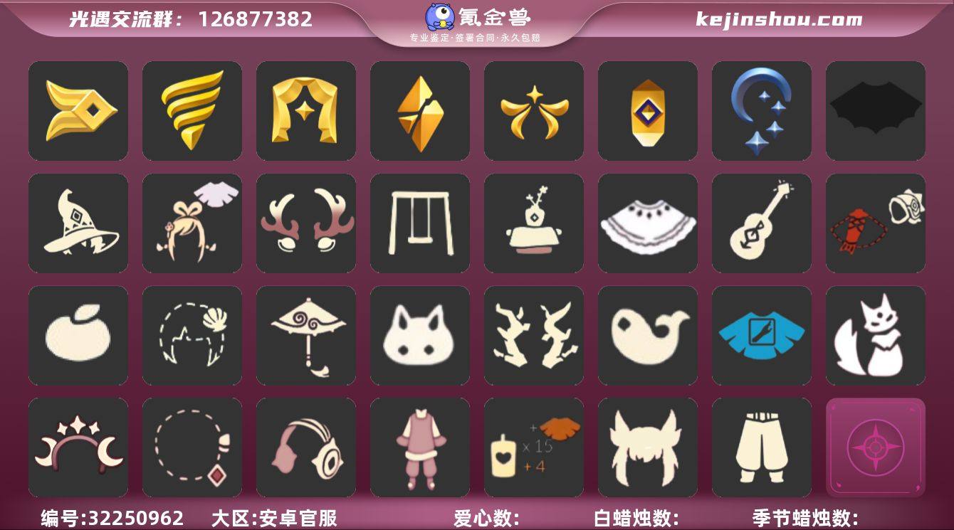 账号类型: 手机账号 季节已毕业: 风行季,潜海季,表演季,破晓季,欧若拉季,夜行季,追忆季 完成地图: 全图毕业 珍稀物品: 白枭,透明蝶翼斗 礼包: 蝙蝠套,巫师,绊爱,鹿角,秋千,茶桌,白绒金,吉他,鲤鱼套,橘子,贝壳,红伞,兔子,枯角,鲤鱼,tgc,猫背饰,星月头饰,彩虹耳钉,彩虹耳机,新年裤,创始人 裤子: 武士裤 发型: 白枭