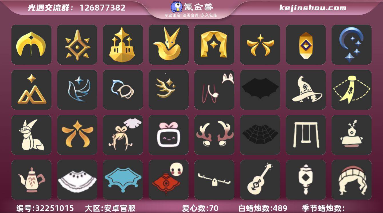 账号类型: 邮箱账号 季节已毕业: 圣岛季,预言季,梦想季,小王子季,表演季,欧若拉季,夜行季,追忆季,拾光季,青鸟季,双星季,迁徙季 完成地图: 晨岛,云野,雨林,霞谷,暮土,禁阁 珍稀物品: 鳐鲲斗篷,阿努比斯(狗头),白枭,透明蝶翼斗,玫瑰花 礼包: 蝙蝠套,巫师,围巾,小狐狸,欧若拉之翼,绊爱,大铁头,鹿角,蜘蛛斗,秋千,茶桌,茶壶,白绒金,瑞雪,福娃,跷跷板,吉他,灯笼,彩虹帽,雪花球,橘子,贝壳,黄伞,兔子,枯角,雪花,猫背饰,星月头饰,彩虹耳钉,彩虹耳机,蝴蝶结,奥利奥,四叶草,姆明饰品套装 裤子: 武士裤,背带裤,搓澡巾,王子服,蓝绿裤 面具: 阿努比斯,凤凰面具,贴花面具,夜行毕业面具,黄眉企鹅面具 面饰: 红耳机,黑框眼镜,青鸟毕业面饰 项链: 围巾 发型: 若笠,虚荣,小王子发型,留辫蘑菇头 头饰: 行军锅头盔,牛仔帽,蓝色音乐会,平顶帽 斗篷: 海洋斗,蟑螂斗,绿芽,粉红绒毛斗篷,遥鲲斗篷,燕尾斗篷,青鸟毕业斗篷 配饰: 雨伞,高音钢琴,相机,玫瑰花,圆鼓,蓝色手碟,鲲灯 亮点: 【优质装备】:预言季,阿努比斯(狗头),表演季,白枭(帝企鹅发),武士裤,圣岛季,梦想季,小王子季(王子季),鳐鲲斗篷,透明蝶翼斗,欧若拉季(欧若拉),行军锅头盔(六边锅帽子)(双耳锅帽子),高音钢琴(白色高脚钢琴),玫瑰花,夜行季,追忆季,牛仔帽(西部帽),相机(季卡相机),拾光季,王子服(小王子套装),蓝绿裤(高领舞服),蟑螂斗(凤凰斗篷),围巾(肩带),蝙蝠套(蝙蝠斗篷)(南瓜头),欧若拉之翼,绊爱(绊爱斗篷)(绊爱礼包),秋千(情人秋千),红耳机,围巾(小王子斗篷)(小王子围巾),大铁头,鹿角(圣诞鹿角),蜘蛛斗(蛛丝斗篷)(蛛网斗篷),巫师(巫师帽),小狐狸(狐狸背包),晨岛,云野,雨林,霞谷,墓土(暮土),禁阁,若笠(箬笠),凤凰面具,贴花面具(丛林黑面具),夜行毕业面具(棕熊面具),黄眉企鹅面具,黑框眼镜(粗框眼镜),小王子发型,留辫蘑菇头,粉红绒毛斗篷(绒毛斗篷),遥鲲斗篷(双翼遥鲲斗),燕...