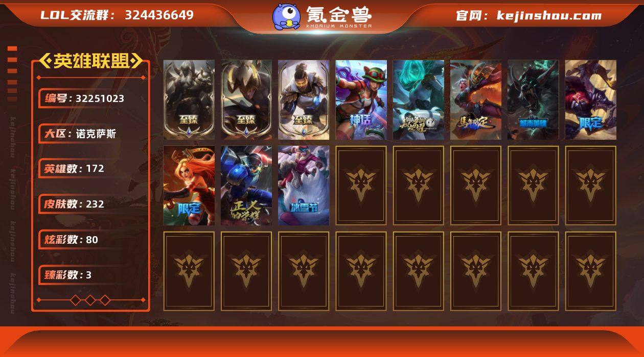 t36950【诺克萨斯】232皮肤 80炫彩 3臻彩 6神话/20限定/16传说/172英雄 账号等级:1036 【重要皮肤】未来战士卢锡安至臻 腥红之月亚托克斯至臻 黑夜使者李青至臻 胜利剑圣易 胜利女神娑娜 胜利之王泰达米尔 胜利巨口克格莫 荣誉使者玛尔扎哈 银龙裁决泰隆 替父从军花木兰 胜利女神瑟庄妮 胜利机器人布里茨 胜利女神奥莉安娜 胜利枪神格雷福斯 胜利枪神卢锡安 胜利之剑亚托克斯 魄罗骑士瑟庄妮 夺命美人卡特琳娜 Fnatic古拉加斯 冰雪节辛吉德 防暴天使凯尔 暗影沃里克 都铎王朝图奇 十五周年纪念希维尔 十周年纪念安妮 源代码乐芙兰 胜利凤凰艾尼维亚 【传说皮肤】约德尔国队长提莫 钢铁军团盖伦 金牌主播德莱文 恶魔男爵瑞兹 腥红之月鬼武姬阿卡丽 黯黑魔龙希瓦娜 蔷薇绅士杰斯 陆地王者4WD布里茨 血石领主弗拉基米尔 女校长菲奥娜 驯龙炮手崔丝塔娜 女皇艾希 烈焰雄心崔丝塔娜 鬼魂新娘莫甘娜 符文战熊沃利贝尔 霸天异形卡兹克 【重要炫彩】冰雪节格雷福斯炫金 霸天巨兽雪崩墨菲特 腥红之月卡特琳娜落樱 源代码乐芙兰梦幻闪击 腥红之月易落樱 草莓味糖果兔宝宝提莫 暗影沃里克至真至诚 黑色荆棘莫甘娜马樱丹 皮城女警凯特琳死亡蔷薇