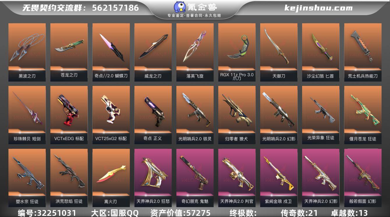 皮肤资产价值:57275 已用源晶点数:1375 苍龙之刃,威龙之刃-耀鳞威龙,匕首-沙尘幻旅 爪刀-RGX 11z Pro 3.0 天御刀-天界神兵//2.0,短剑-珍珠棘贝,荒土机兵热能刀 蝴蝶刀-奇点//2.0 落英飞旋-千灵华绽 黑波之刃-塑水宗 离火刃 獠犬-归零者,幻影-光明哨兵2.0,光荣异象 狂徒,狂徒-偃月苍龙,狂徒-塑水宗,狂徒-洪荒怒焰,戍卫-紫阙金琅,幻影-天界神兵2.0,幻影-般若假面,幻影-侦察力量,狂徒-盖亚的复仇,狂徒-海洋之星,狂徒-紫阙金琅,狂徒-掠影,幻影-末日之翼,幻影-纳米打击,幻影-珍珠棘贝,狂徒-诡秘蛇影,狂徒-荒土机兵,狂徒-沙尘幻旅,獠犬-复古浪潮,獠犬-胡桃狂想,戍卫-战术熊与伙伴们,戍卫-浮光跃金,戍卫-萌彩剪影,戍卫-逆冲蛮牛,戍卫-甜蜜战术,戍卫-折光棱晶,戍卫-珍珠棘贝 骇灵-光明哨兵2.0,蜂刺-纤云弄巧,蜂刺-超限闪存,蜂刺-胡桃狂想,蜂刺-深海水族,骇灵-浮光跃金,骇灵-荒土机兵,骇灵-流星兵团,骇灵-沙尘幻旅,骇灵-珍珠棘贝,蜂刺-折光棱晶 奥丁-天界神兵2.0,奥丁-末日之翼,奥丁-纳米打击,奥丁-日耀风暴,战神-浮光跃金,战神-萌彩剪影,战神-深海水族 冥驹-堕天遗武,飞将-末日之翼,飞将-沙尘幻旅,冥驹-复古浪潮,冥驹-荒土机兵,冥驹-胡桃狂想,冥驹-模拟赫兹,莽侠-超限闪存,莽侠-诡秘蛇影,莽侠-深海水族 标配-VCT25xG2,标配-VCTxEDG,正义-奇点,狂怒-天界神兵2.0,鬼魅-奇幻朋克,标配-浮光跃金,标配-荒土机兵,标配-折光棱晶,标配-战术熊与伙伴们,短炮-末日之翼,短炮-深海水族,短炮-纤云弄巧,鬼魅-胡桃狂想,鬼魅-幻心猎手,鬼魅-模拟赫兹,狂怒-幻语魔咒,狂怒-萌彩剪影,狂怒-逆冲蛮牛,狂怒-战术熊与伙伴们,狂怒-珍珠棘贝,正义-复古浪潮,正义-纳米打击,正义-沙尘幻旅 判官-天界神兵2.0,判官-诡秘蛇影,判官-萌彩剪影,判官-纳米打击,雄鹿-复古浪潮,雄鹿-模拟赫兹,雄鹿-逆冲蛮牛 捣蛋鬼出没卡面,分崩离析卡面,无畏契约GO!第一卷:捷风卡面,无畏契约GO!第一卷:零卡面,无畏契约GO!第一卷:芮娜卡面,无畏契约GO!第一卷:贤者卡面,虹吸式咖啡壶卡面,离火刃凤卡面,离火刃凰卡面,势不可挡不死鸟卡面,势不可挡捷风卡面,势不可挡KO卡面,势不可挡幽影卡面,双城之战拥抱卡面,天界神兵2.0卡面,VCTxG2卡面,危化小分队差点玩完卡面,危化小分队双双受困卡面,5周年重制版卡面 卖家说:离火刃还有200r点 精氪号