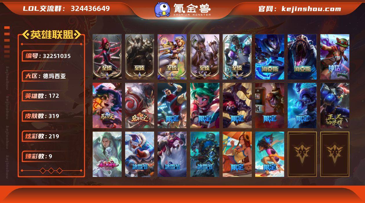 t37116【德玛西亚】 319皮肤 219炫彩 9臻彩 10神话/36限定/37传说/172英雄 账号等级:425 【重要头像】云顶战斗学院伊泽瑞尔 云顶星守阿卡丽 【重要皮肤】黑色玫瑰假面舞会卡特琳娜至臻 星之守护者艾克至臻 电玩女神凯特琳至臻 魅惑女巫厄运小姐至臻 腥红之月亚托克斯至臻 腥红之月亚托克斯2022至臻 海克斯科技雷克顿 海克斯科技嘉文四世 胜利剑圣易 玉剑传说舞龙卫 星之守护者佐伊 银龙裁决泰隆 剪纸仙灵加里奥 龙马烈焰波比 胜利机器人布里茨 胜利枪神卢锡安 胜利之剑亚托克斯 水晶玫瑰斯维因 双城之战2微光实验室辛吉德 北极星使者沃里克 持胡萝卜的雪人易 魄罗骑士瑟庄妮 克烈古拉伯爵 海之歌奈德丽 泳池派对塔莉垭 泳池派对蕾欧娜 制胜金靴李青 SKTT1扎克 SKTT1阿利斯塔 SSW雷恩加尔 暗杀星奥莉安娜 Fnatic古拉加斯 Fnatic卡尔萨斯 防暴士兵辛吉德 防暴天使凯尔 冠军典狱长锤石 春晖大帝锤石 鬼影森森茂凯 圣诞老人古拉加斯 圣诞玩偶波比 雪默丁格 波比的巧克力工坊 都铎王朝图奇 十五周年纪念希维尔 十周年纪念安妮 暗裔英雄盖伦 【传说皮肤】战斗学院凯特琳 源计划泯灭雷克顿 星之守护者阿狸 黑夜使者索拉卡 铁哥们儿奥拉夫 神拳李青 电玩女神娑娜 耀星女神拉克丝 魔女伊芙琳 黎明使者永恩 黑夜使者亚索 霸天异形卡兹克 律政大亨蒙多 女警狙击凯特琳 地狱行者孙悟空 丧尸布兰德 最终BOSS维迦 源计划林易 女校长菲奥娜 血石领主弗拉基米尔 地狱之门卫士加里奥 合金巨兽努努和威朗普 上古战魂魔腾 奥德赛凯隐 炼狱魔犬内瑟斯 泳池派对吉格斯 宇航员诺提勒斯 战场女武神凯尔 恶魔男爵瑞兹 绅士科加斯 战地机甲厄加特 真实伤害艾克 邪鸦魅影乐芙兰 灌篮高手德莱厄斯 战地巨兽科加斯 烈焰雄心崔丝塔娜 双重冰晶艾尼维亚...