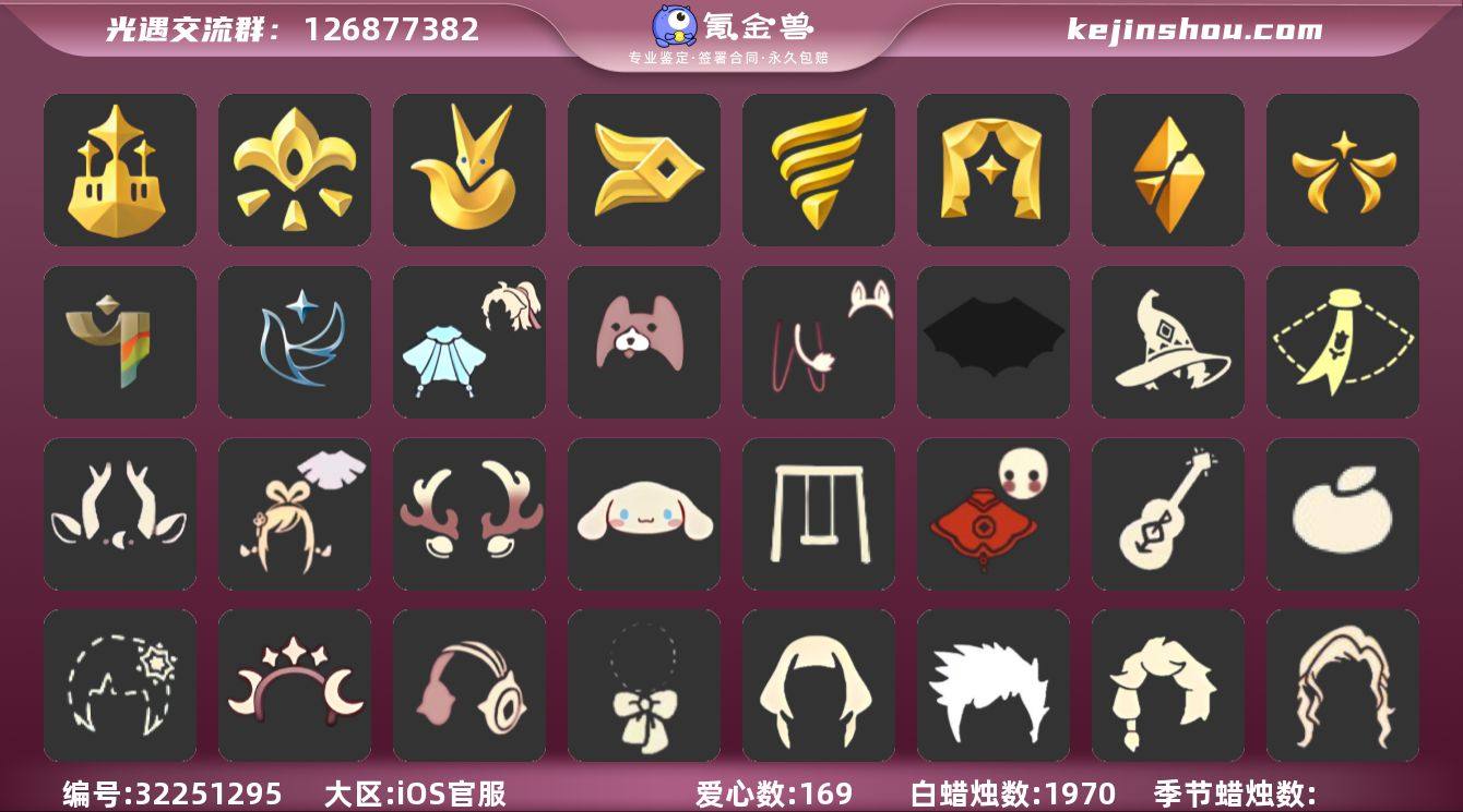 账号类型: 手机账号 季节已毕业: 梦想季,小王子季,风行季,潜海季,表演季,破晓季,欧若拉季,集结季,彩染季,青鸟季 完成地图: 雨林,霞谷 珍稀物品: 白枭,透明蝶翼斗,玫瑰花 礼包: 蝙蝠套,巫师,围巾,九色鹿角,绊爱,鹿角,大耳狗发饰,秋千,福娃,吉他,橘子,雪花,星月头饰,彩虹耳机,蝴蝶结,姆明饰品套装,小狗周年发饰,青衫落拓礼包 裤子: 武士裤,背带裤,搓澡巾,击剑裤,王子服,蓝绿裤 面具: 凤凰面具,贴花面具,呼吸面具,黄眉企鹅面具,辉光羚羊面具 面饰: 红耳机,青鸟毕业面饰 发型: 若笠,虚荣,单侧绑发,小王子发型,留辫蘑菇头 头饰: 行军锅头盔,羽毛发饰,蓝色音乐会,平顶帽 斗篷: 海洋斗,蟑螂斗,遥鲲斗篷,黄色连帽披风,燕尾斗篷,冥龙斗篷,彩染围巾斗篷,青鸟毕业斗篷 配饰: 雨伞,高音钢琴,玫瑰花,圆鼓 亮点: 【优质装备】:表演季,白枭(帝企鹅发),武士裤,梦想季,小王子季(王子季),风行季,潜海季,破晓季,透明蝶翼斗,欧若拉季(欧若拉),行军锅头盔(六边锅帽子)(双耳锅帽子),羽毛发饰(多羽发饰),高音钢琴(白色高脚钢琴),集结季,玫瑰花,王子服(小王子套装),蓝绿裤(高领舞服),蟑螂斗(凤凰斗篷),凤凰面具,贴花面具(丛林黑面具),呼吸面具(潜水面具),黄眉企鹅面具,单侧绑发(单边小辫),小王子发型,留辫蘑菇头,遥鲲斗篷(双翼遥鲲斗),黄色连帽披风(连帽斗篷)(斜边队长斗篷),燕尾斗篷,冥龙斗篷,圆鼓(手拍大鼓),辉光羚羊面具,彩染季,青鸟季,青鸟毕业面饰(青鸟面饰),青鸟毕业斗篷(青鸟斗篷),蝙蝠套(蝙蝠斗篷)(南瓜头),福娃(福娃礼包)(春之日礼包)(铜钱斗),绊爱(绊爱斗篷)(绊爱礼包),秋千(情人秋千),红耳机,围巾(小王子斗篷)(小王子围巾),九色鹿角(神鹿祝福头饰)(神鹿祝福礼包),鹿角(圣诞鹿角),大耳狗发饰(迷你大耳狗发饰),吉他(音韵吉他)(白吉他),姆明饰品套装(姆明尾巴),巫师(巫师帽),雨林,霞谷,若笠(箬笠),彩虹耳机,星月头饰(星月头冠),蝴...